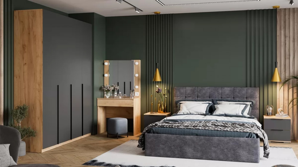 Спальный гарнитур «Джоли» №2 Дуб Крафт золотой, Графит матовый, Микровелюр Wellmart Graphite в Тюмени