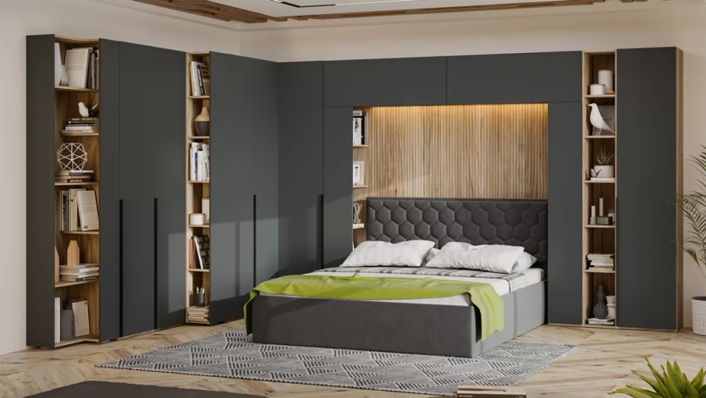 Спальный гарнитур «Порто» №2 Яблоня Беллуно, Графит софт, Велюр Confetti Stone в Тюмени