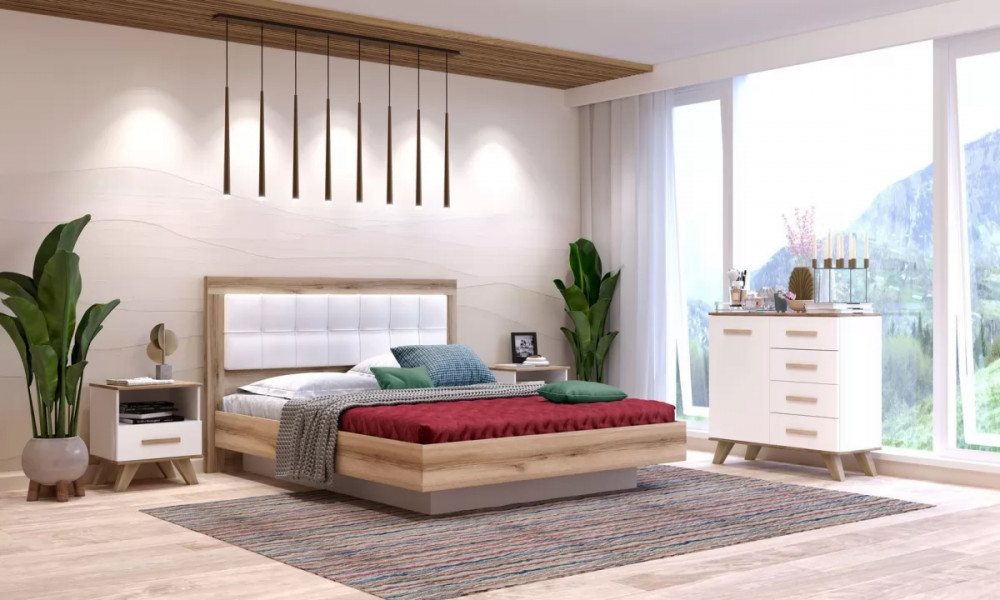 1.Кровать-5 с ПМ "Вега Скандинавия" Дуб каньон белый/Белый с снованием 1600*2000 мм.