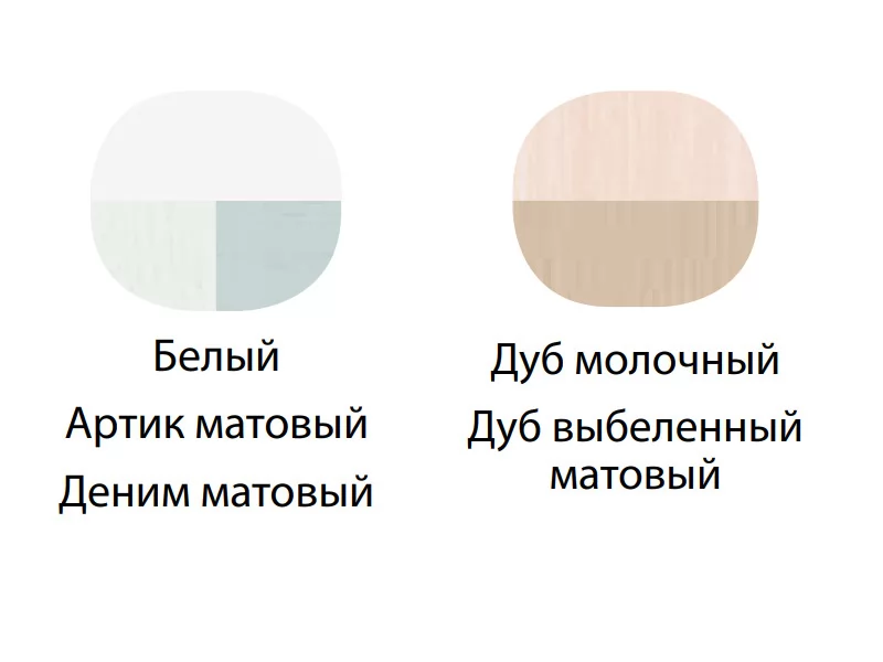 | Цвет (каркас/фасад) | Дуб молочный/Дуб выбеленный, Белый/Деним, Белый/Артик, Белый/Артик/Деним |