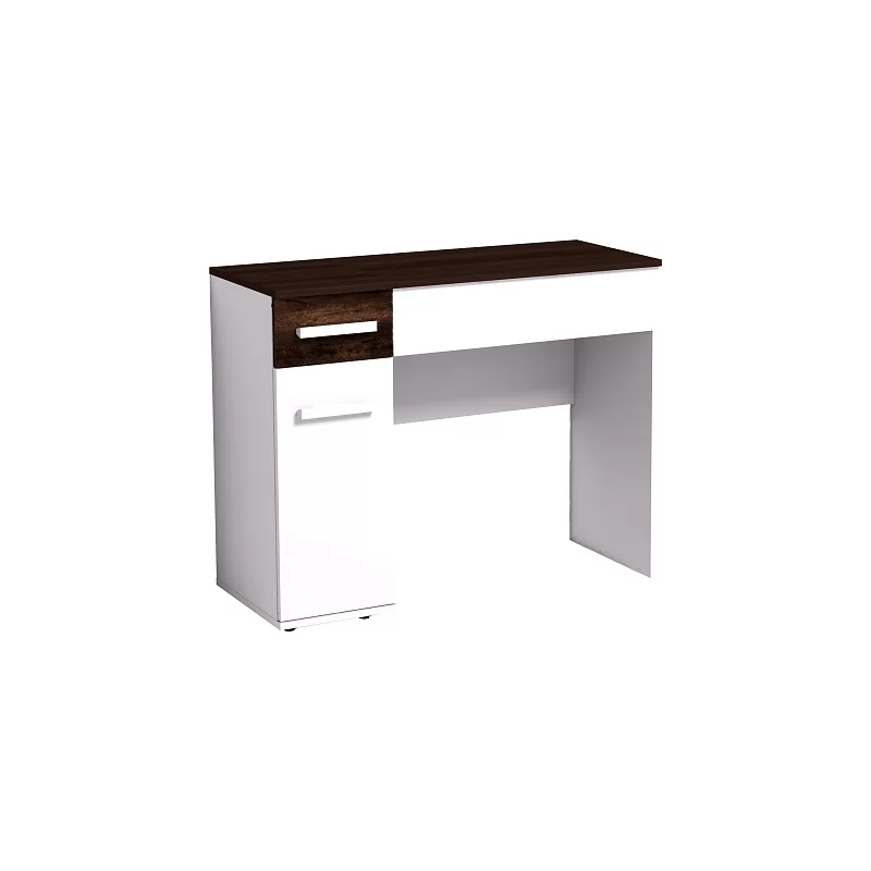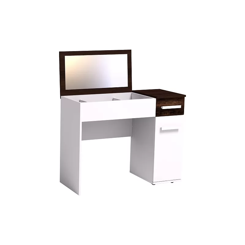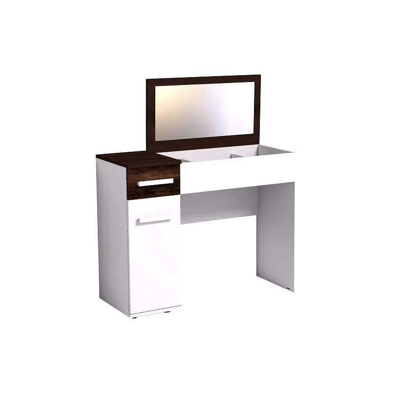 Простой с виду туалетный столик из коллекции Норвуд обладает интересной конструкцией. Откидная контрастная крышка стола скрывает нишу с органайзером для хранения мелких аксессуаров. На внутренней стороне крышки - зеркало, перед которым удобно наносить макияж и проводить косметические процедуры. Сбоку – отделение с полками за распашной дверцей и выдвижным ящиком, фасад которого выполнен из брашированного дерева цвета Орех шоколадный. Столик в закрытом состоянии можно использовать для работы на компьютере или с документами. Модуль можно собирать как на левую, так и на правую сторону.