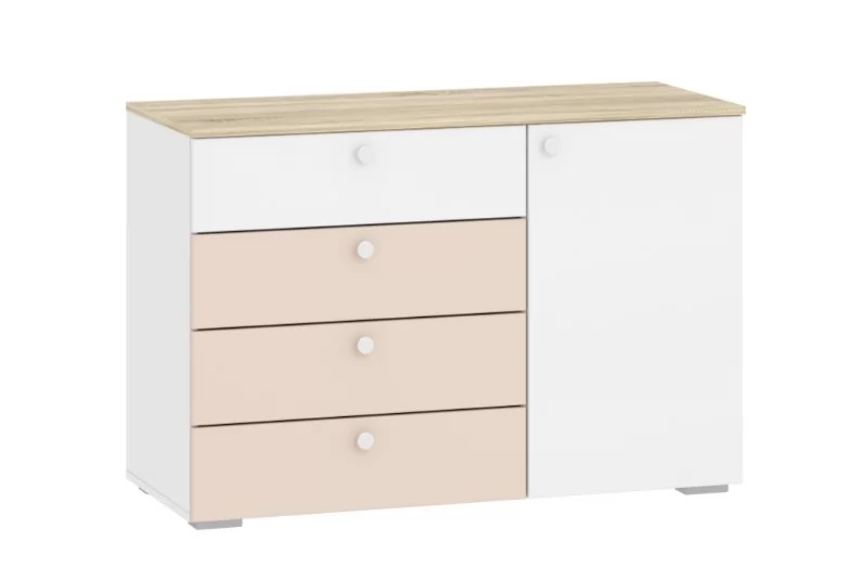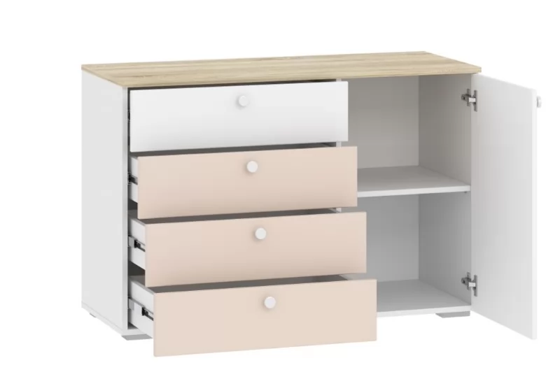 Комод НМ 041.39_Комод Банни прекрасный выбор для интерьера в Скандинавском стиле.Три удобных выдвижных ящика и боковое отделение с полками станут вместительным местом для хранения белья, предметов одежды и аксессуаров. Выдвижные ящики оснащены шариковыми направляющими полного выдвижения, равномерно распределяют вес содержимого и обеспечивают плавный бесшумный ход ящика.