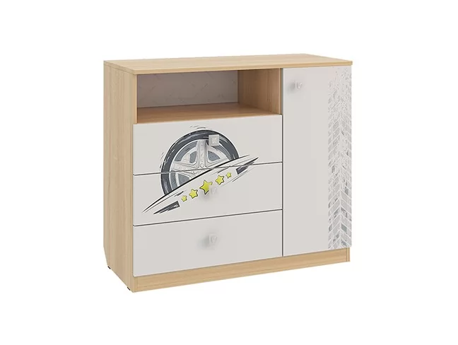 3 выкатных ящика, ниша и закрытые полки, все что нужно что бы разместить вещи вашего ребенка. Эффектный принтерный рисунок на фасадах выдержан в общем стилистическом решении. Рисунок устойчив к истиранию и ультрафиолету. Открытая ниша для гаджетов, столешница толщиной 16мм, на которой с легкостью поместиться большой телевизор.