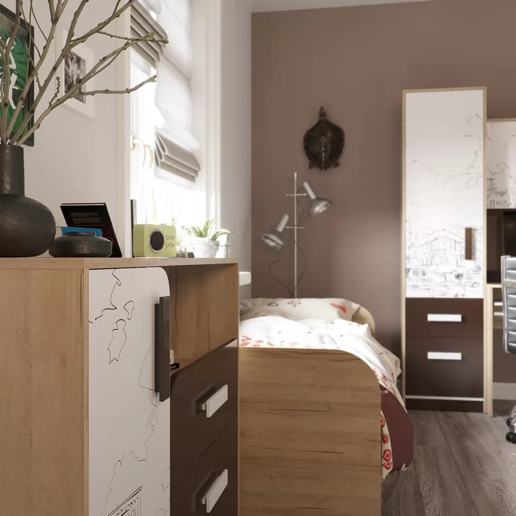 Детская состоит из большого количества модулей, соответственно, их можно комбинировать по желанию и по мере взросления ребенка. Это позволит детской «расти» вместе со своим юным владельцем.