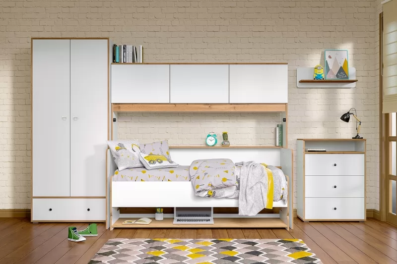 Светлая и аккуратная молодёжная мебель. Основой модульной системы является кровать-трансформер. Её столешница имеет постоянный горизонт, то есть при трансформации не нужно убирать вещи. Система хранения с подъёмными фасадами значительно расширяет функционал.