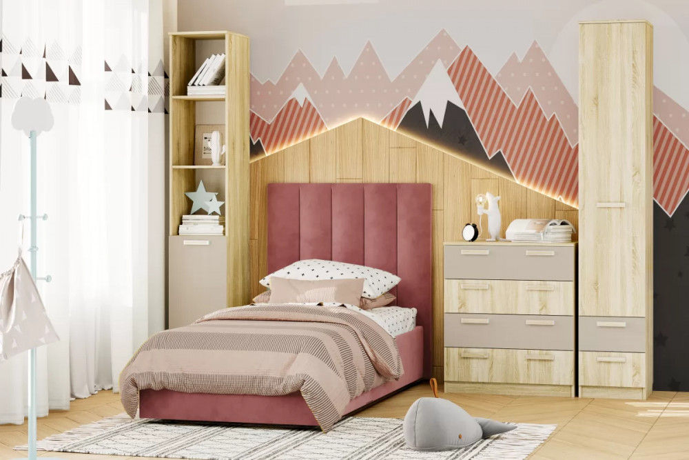 Кровати выполнены в нейтральных и ярких тканях велюр, что позволяет подобрать подходящий вариант почти под любой интерьер детской мальчиков и девочек. Дизайн модели отличается высоким изголовьем с вертикальными строчками и углублениями.