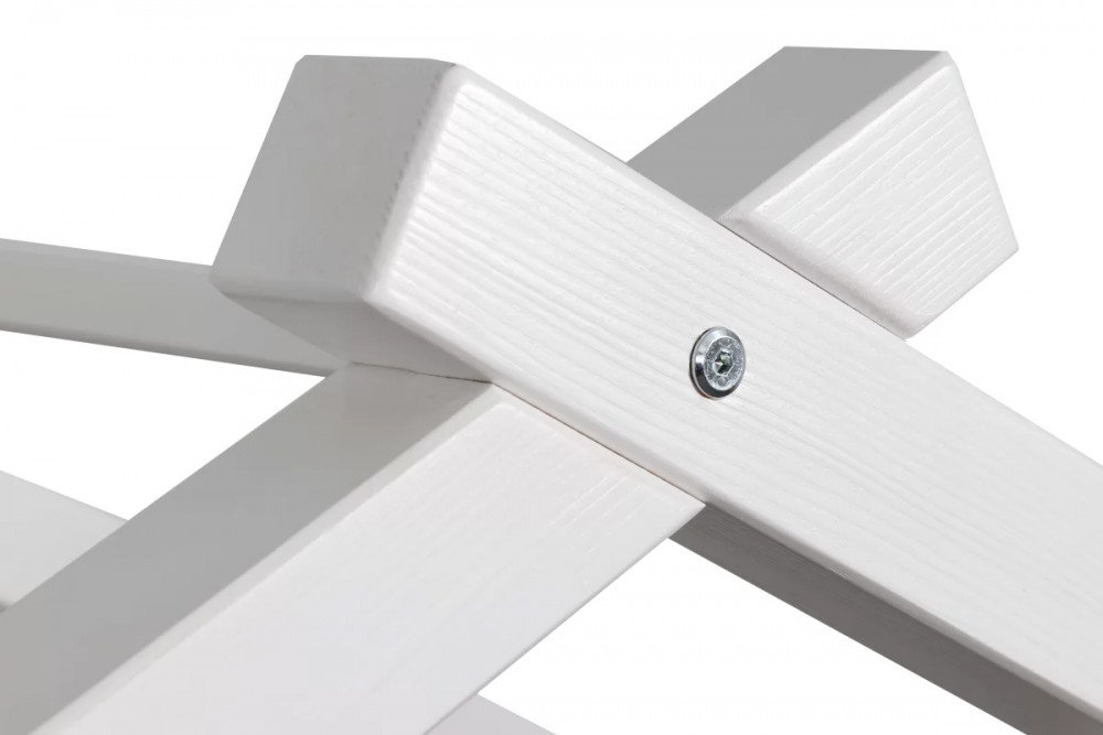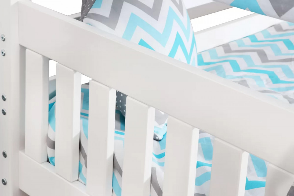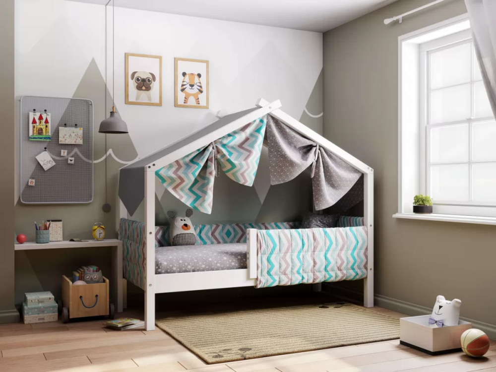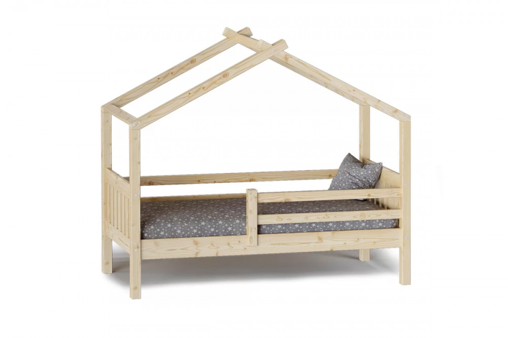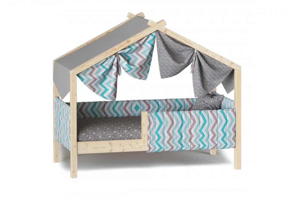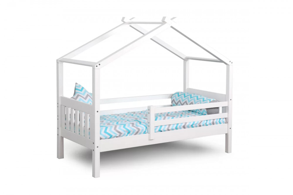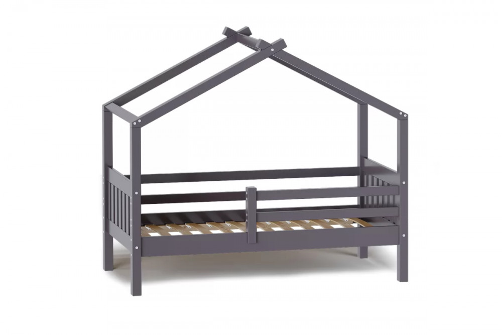 Каркас укомплектован основанием из поперечных гнутых ламелей. Головная и ножная спинки соединены стропилами, образующими крышу: если дополнить кроватку текстильными аксессуарами в виде балдахина и мягких бортиков, малыш будет ощущать себя в собственном уютном домике. В комплектацию кровати входит ортопедическое основание из гнутоклееных ламелей.