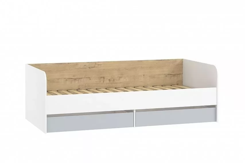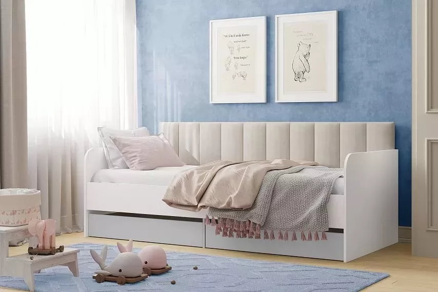 Односпальная кровать подходит для детской мальчиков и девочек в современном, скандинавском и стиле лофт. В кровати предусмотрены ящики для хранения постельного белья или игрушек. Натуральный материал ламелей не вызывает аллергии и безопасен для здоровья. Изогнутая форма ламелей придает основанию спального места большую прочность и дополняет ортопедические свойства матраса.