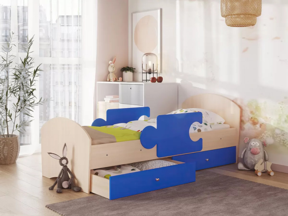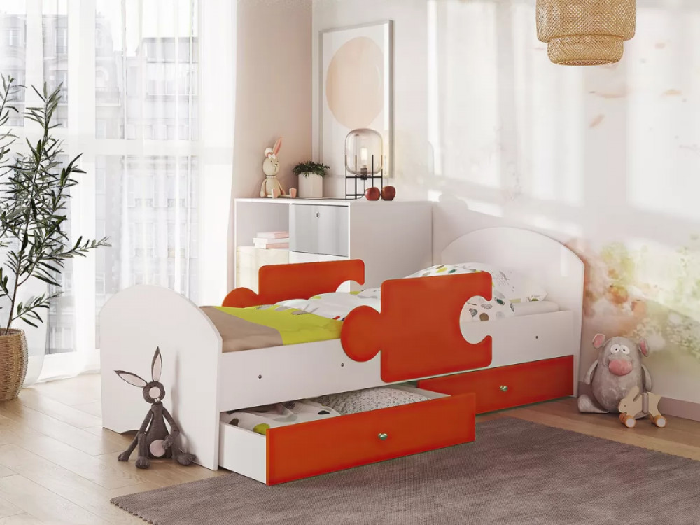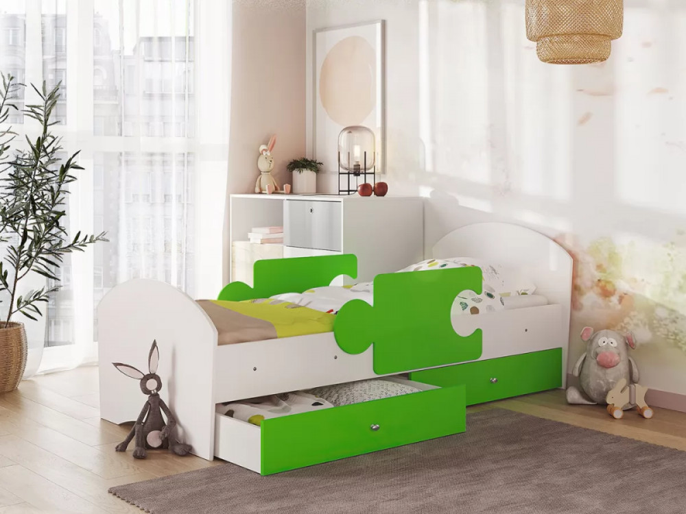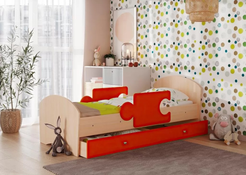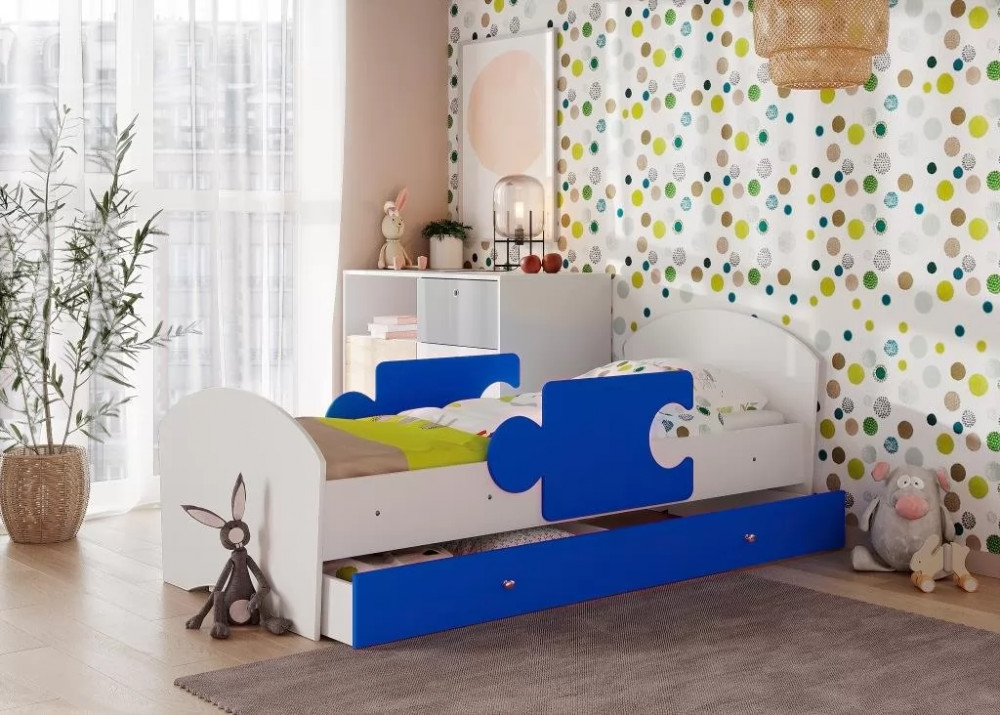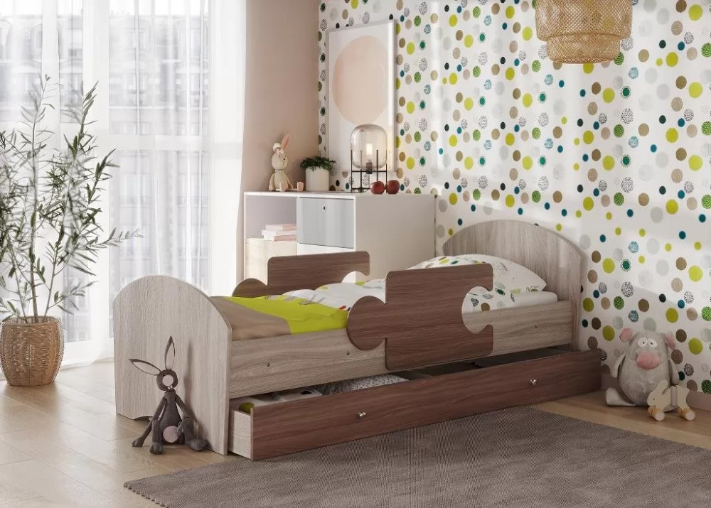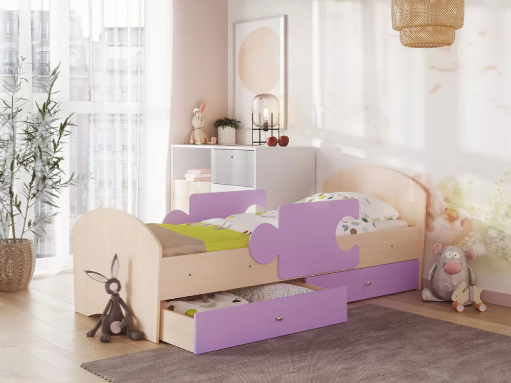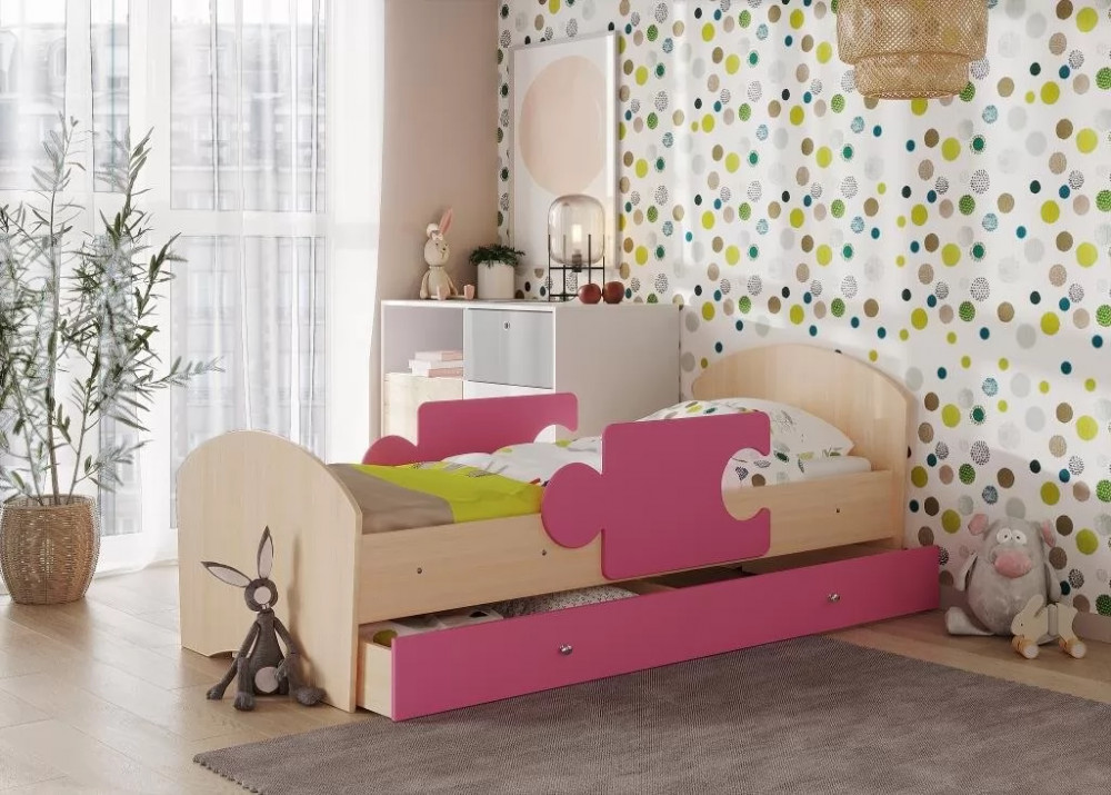 Благодаря большому выбору цветов, Вы можете купить кровать в нужном варианте. Можно доукомплектовать бортиками в форме пазлов(2 шт) или ящиком на направляющих.