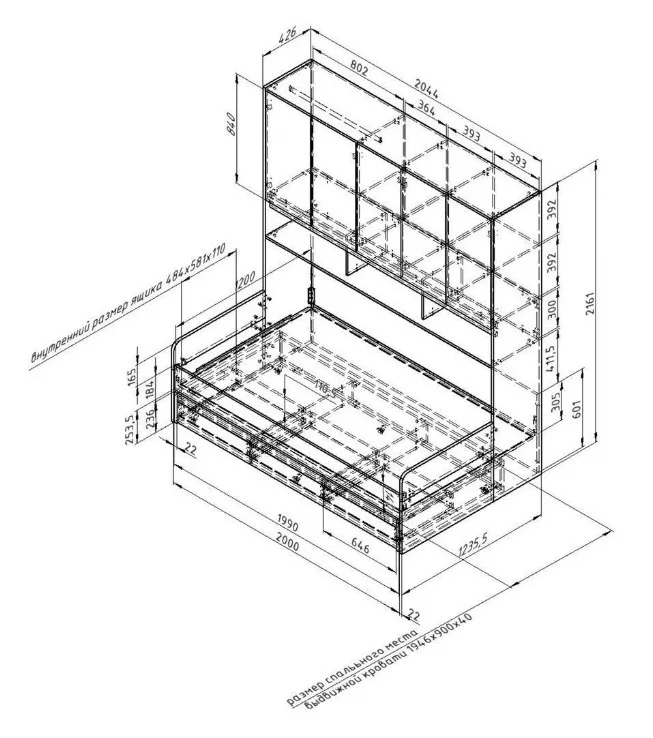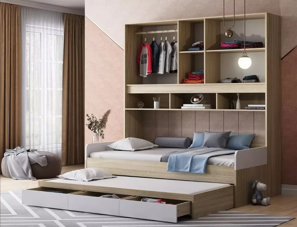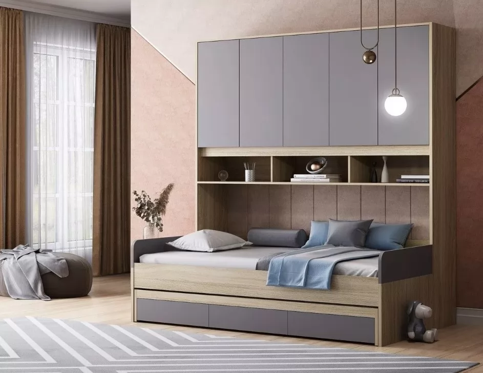 Антресоль состоит из открытых полок и закрытых шкафов, оснащенных полками и штангой для вешалок. Под основанием располагается дополнительная выкатная кровать со спальным местом размером 90*195 см. Максимальная высота матраса для выкатной кровати: 40 мм. Выкатная кровать оборудована ящиками для постельных принадлежностей или других вещей.