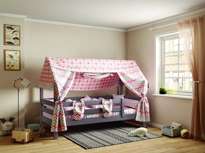 Прочный и долговечный массив сосны с безопасным для здоровья покрытием – классический выбор для детской мебели. В комплектацию кровати входит ортопедическое основание из гнутоклееных ламелей. Дополнительно можно приобрести выкатные ящики для постельных принадлежностей, а также текстиль Соня (балдахин, подушки, покрывало, карман и флажки). При покупке матраса следует ориентироваться на размеры спального места – 190х80 см, оптимальная высота – 13-15 см.