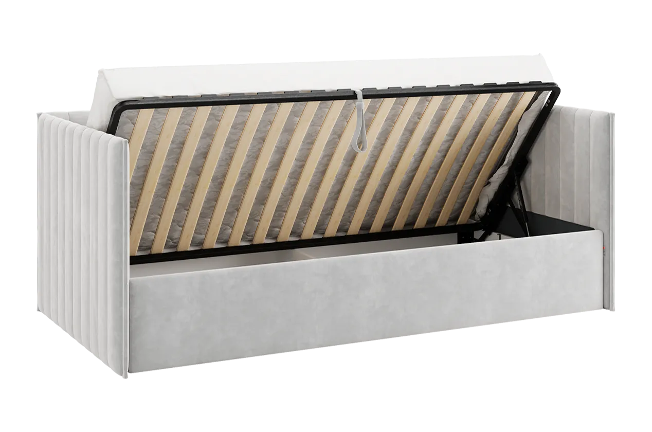 Подъемный механизм позволяет легко скрыть под матрасом дополнительное пространство для хранения вещей — идеально для хранения постельного белья, игрушек или сезонной одежды.