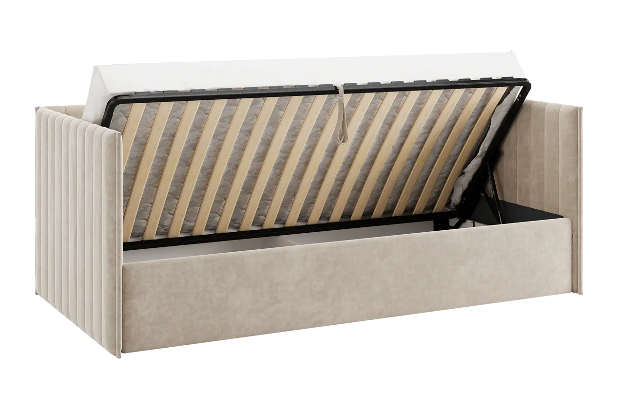 Подъемный механизм позволяет легко скрыть под матрасом дополнительное пространство для хранения вещей — идеально для хранения постельного белья, игрушек или сезонной одежды.