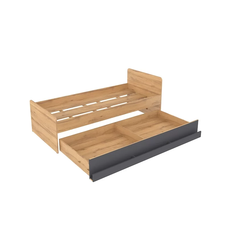 ЛОЙС 80 Кровать выполнена как подростковая кровать-тахта с большим выкатным ящиком на роликах. Изголовье и изножье со скругленными углами облицованы ударопрочной кромкой ПВХ 2 мм, что, безусловно, немаловажно для детей и родителей, выбирающих мебель. Обратите внимание, что изножье совсем не высокое и не будет мешать садиться на кровать даже с этой стороны, поэтому кровать можно ставить не только у стены. Кроватный ящик открывается за ручку-карман. Такой импровизированный карман дает возможность аккуратно сложить необходимые перед сном вещи: книгу, телефон, любимую игрушку. Выдвижной ящик используйте как место для хранения или как дополнительное спальное место. Если планируется дополнительное полноценное спальное место, достаточно не устанавливать делитель при сборке и приобрести матрас. Рекомендуемый размер матраса для основного спального места - 2000х900 мм, для дополнительного спального места - 1900х800х180 мм. Дно спального места кровати из ЛДСП усилено специальными ребрами жесткости из фанеры 18 мм и рассчитано на нагрузку до 80 кг
