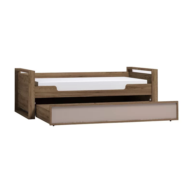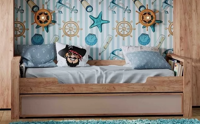 Детская или подростковая кровать-тахта с большим ящиком глубиной 182 мм на выкатных роликах. Его можно использовать как место для хранения постельного белья или как дополнительное спальное место для незапланированных гостей. Для полноценного спального места достаточно убрать разделитель и положить матрас. Размер матраса для основного спального места 190х90 см. Размер матраса для дополнительного спального места: 190х80 см, высотой до 18 см. Дополнительные боковые ниши в кровати помогут подростку держать под рукой необходимые перед сном вещи. Бонусом для современных детей станет компактная встроенная в кровать USB зарядка для телефонов и планшетов.