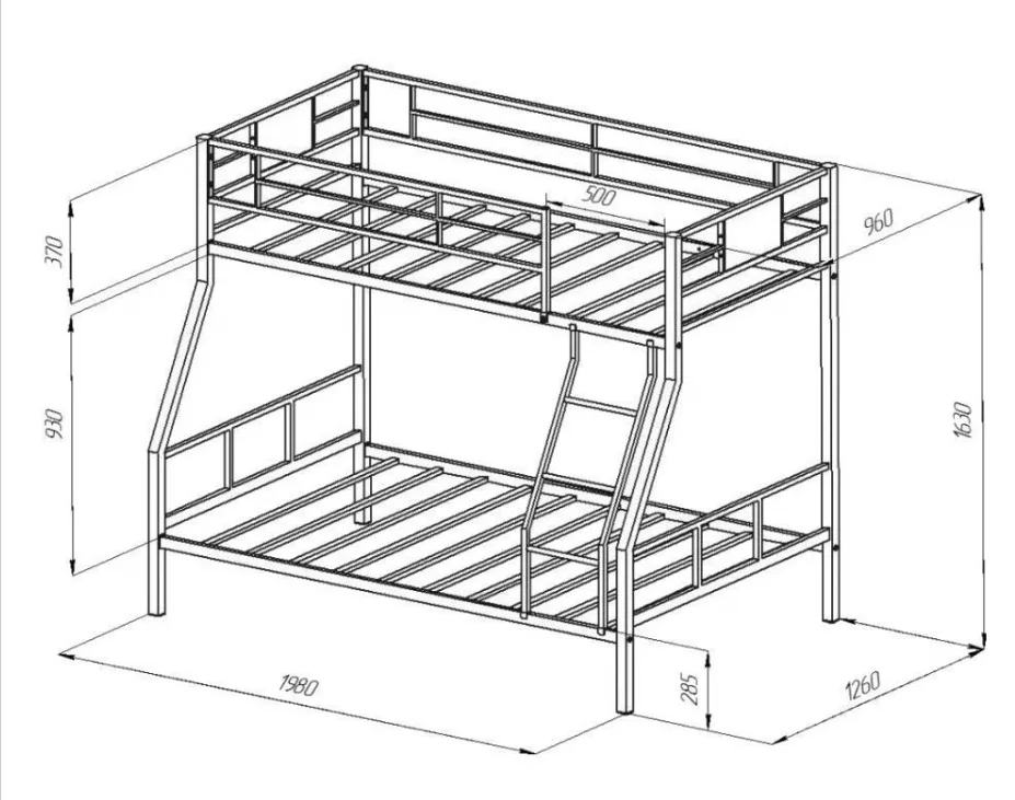 Материал каркаса двухъярусной кровати: стальная труба размером 40*40 мм, 40*20 мм. Все металлические элементы кровати покрыты износоустойчивой полимерной порошковой краской без запаха.