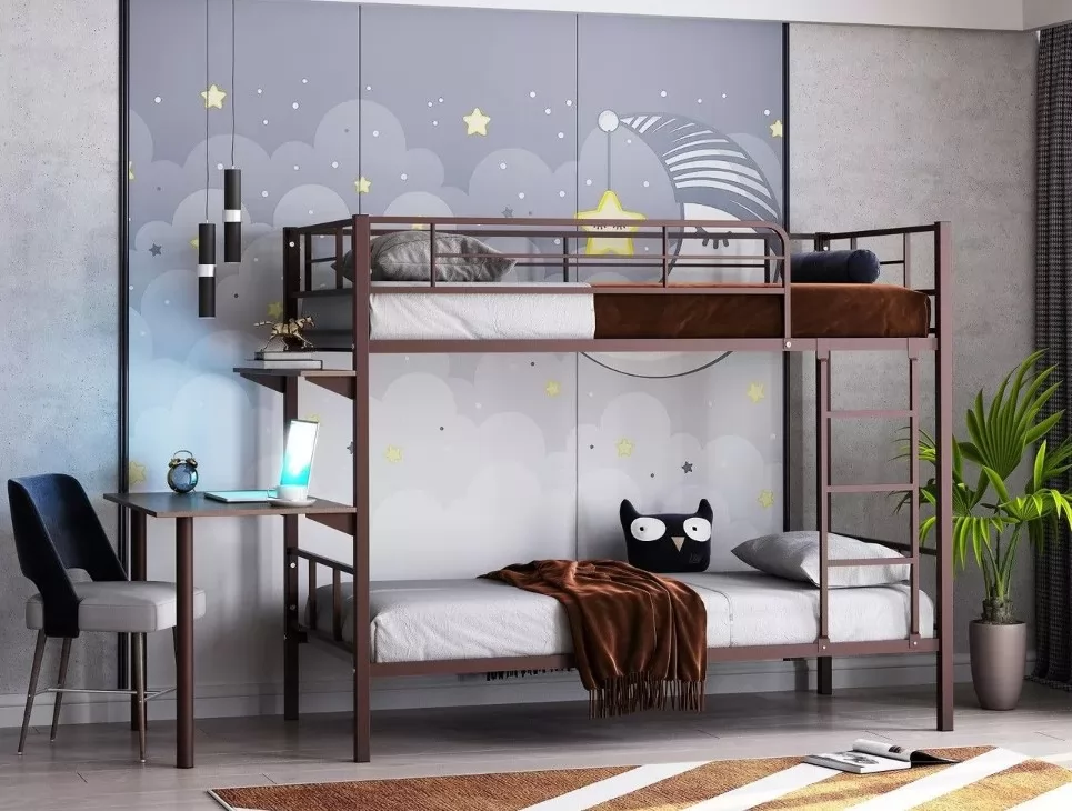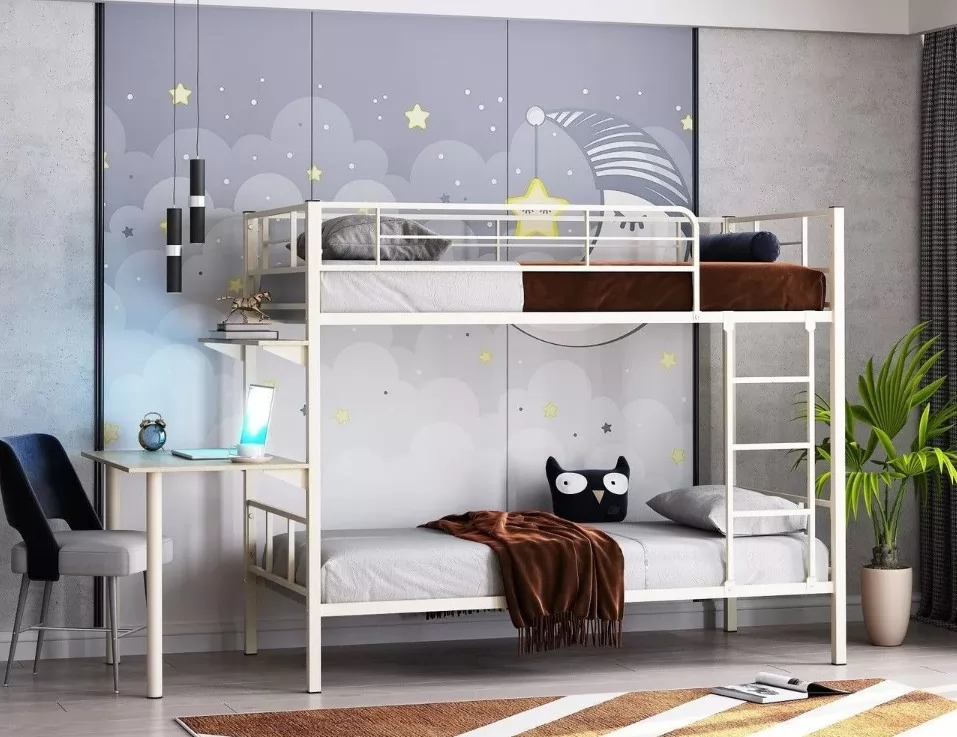 Материал каркаса двухъярусной кровати: стальная труба размером 40*40 мм, 40*20 мм. Все металлические элементы кровати покрыты износоустойчивой полимерной порошковой краской без запаха.