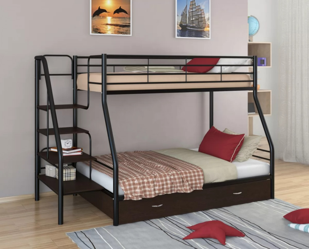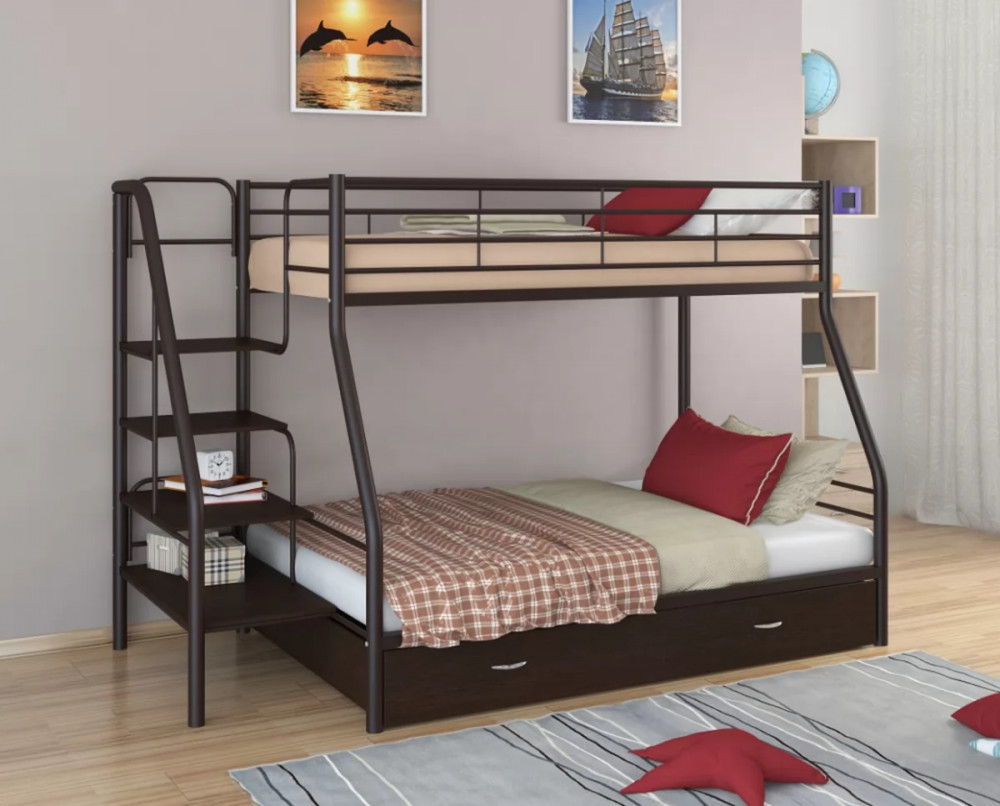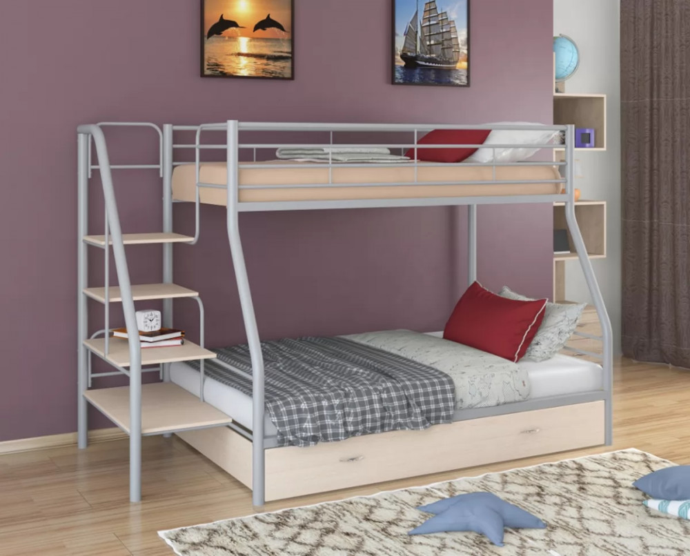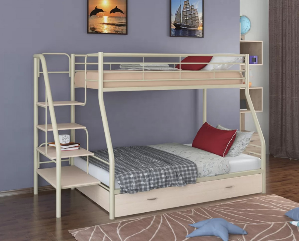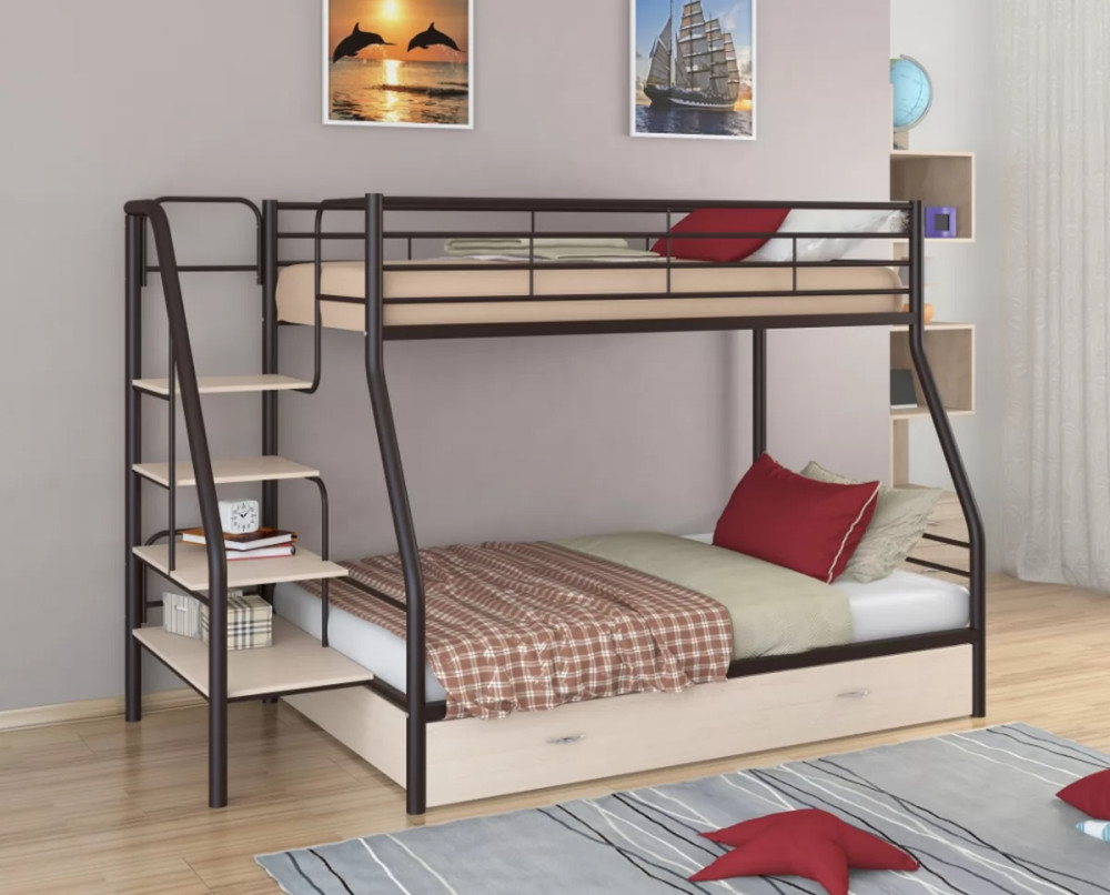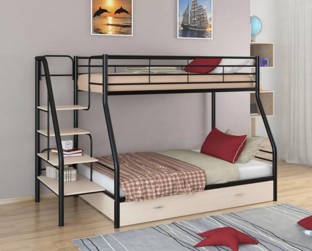 Конструкция кровати предусматривает два спальных места размером: 90*190 см - верхнее, 120*190 см - нижнее. Верхнее спальное место защищено бортиками. Прочную лестницу с широкими ступенями можно установить справа или слева. Под нижним спальным местом располагается вместительный выкатной ящик, в котором можно хранить постельные принадлежности, одежду или другие вещи.