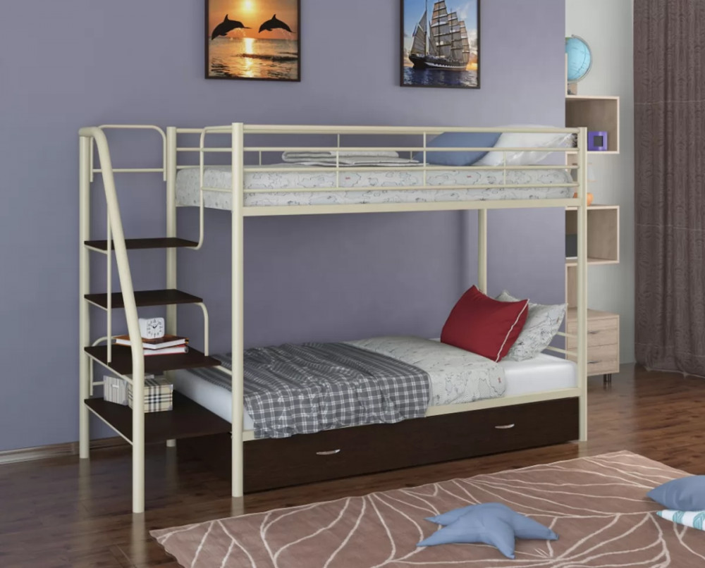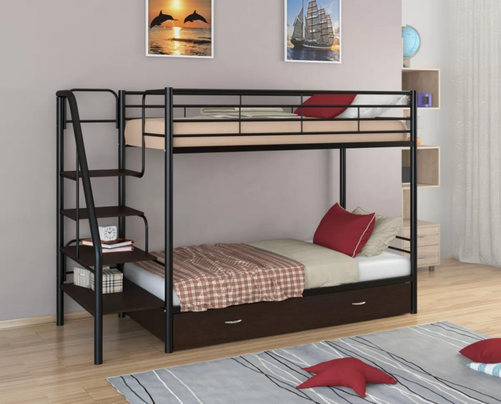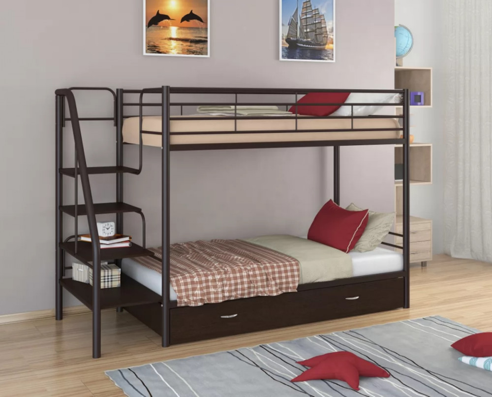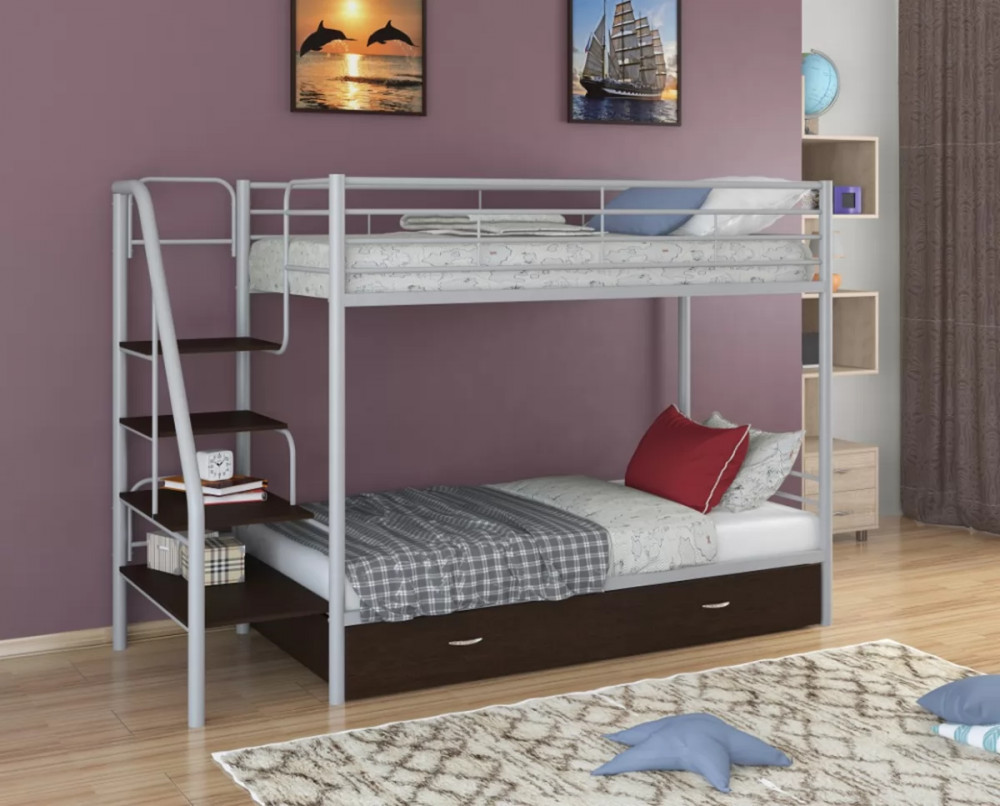 Материал каркаса: стальная труба. Все металлические элементы кровати покрыты износоустойчивой полимерной порошковой краской без запаха. Ступени лестницы и ящик - из ЛДСП. Двухъярусную кровать можно собирать и разбирать неограниченное количество раз, и от этого она не потеряет в прочности и качестве. Гарантия производителя: 18 мес.