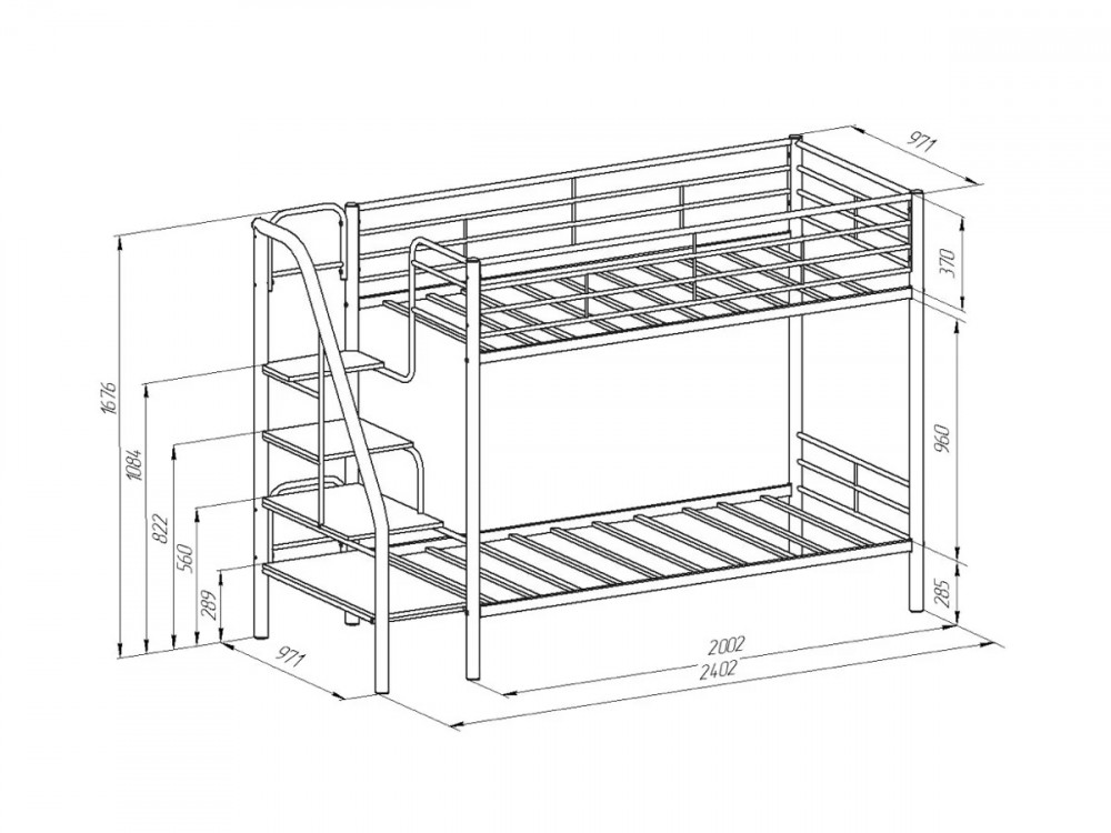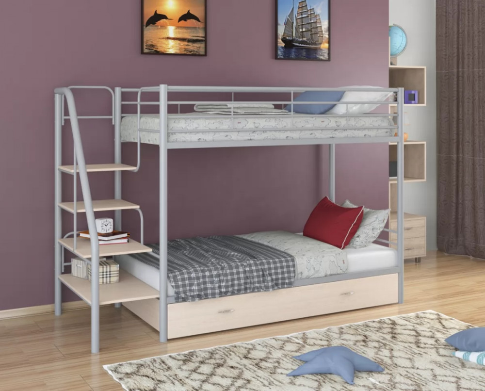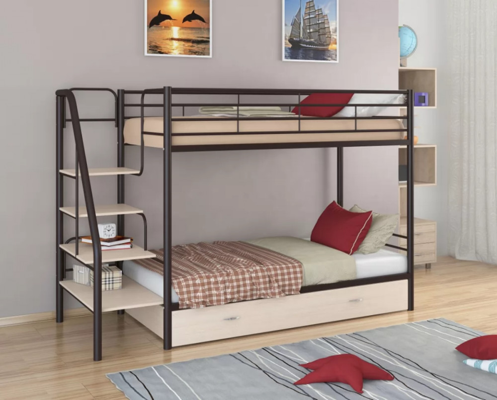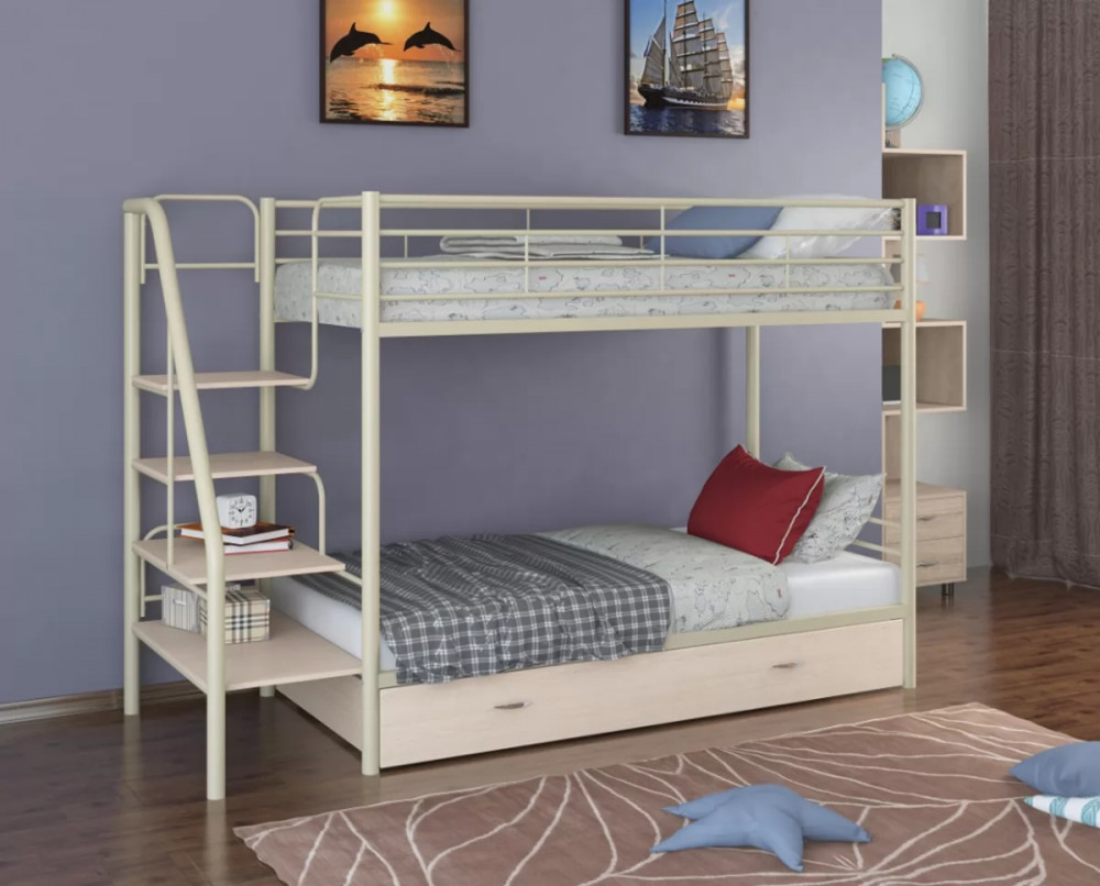 Материал каркаса: стальная труба. Все металлические элементы кровати покрыты износоустойчивой полимерной порошковой краской без запаха. Ступени лестницы и ящик - из ЛДСП. Двухъярусную кровать можно собирать и разбирать неограниченное количество раз, и от этого она не потеряет в прочности и качестве. Гарантия производителя: 18 мес.