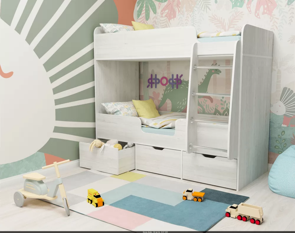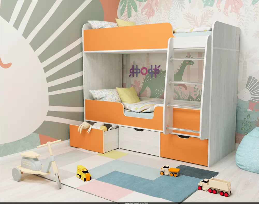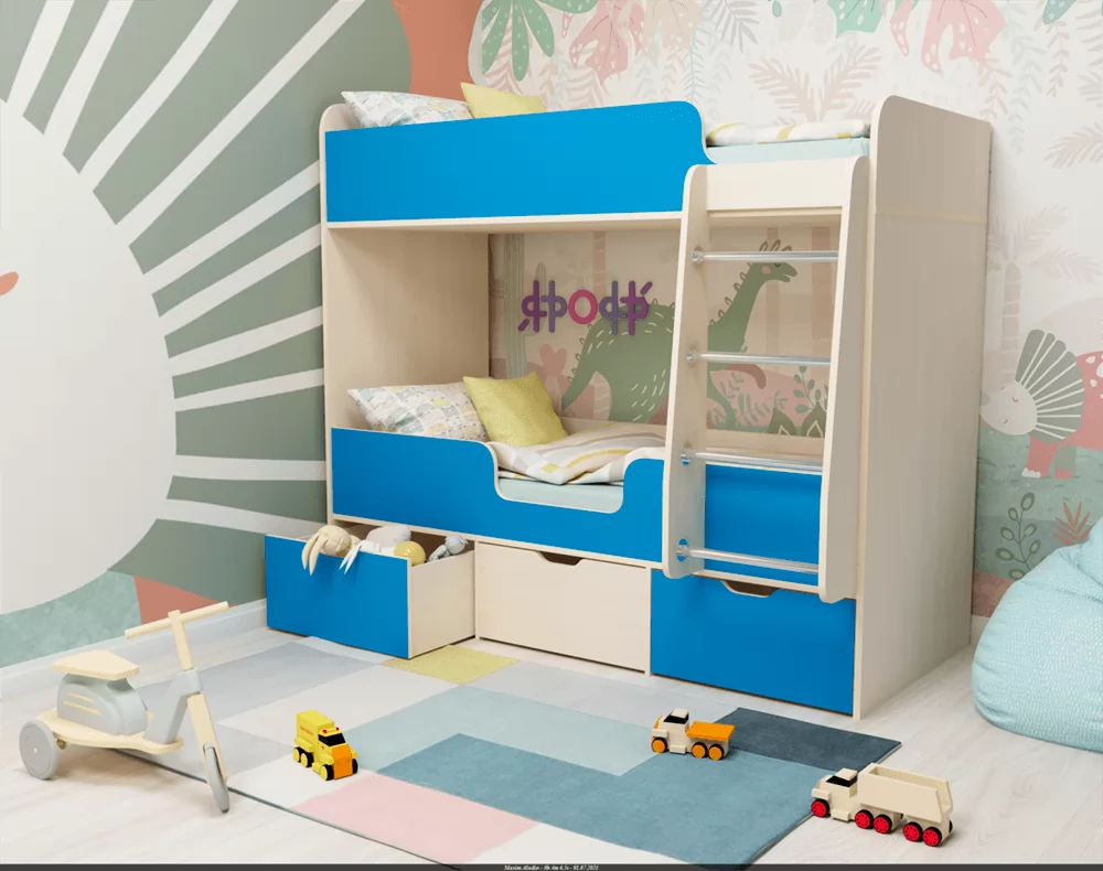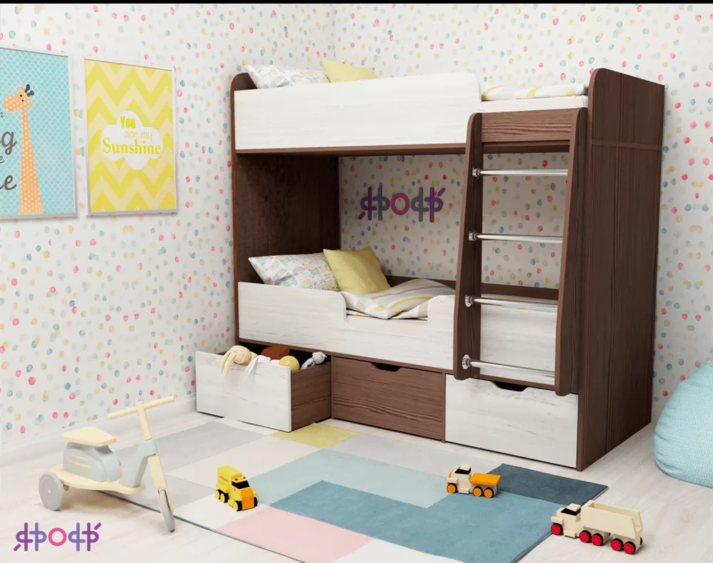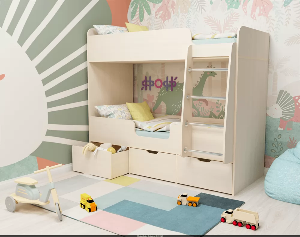 Под нижней кроватью расположены три выкатных ящика, в которых можно складывать постельное белье, подушки, что позволит содержать комнату в порядке и не захламлять ее вещами. К спальному месту, которое расположено на втором ярусе, ведет прочная металлическая лесенка, сама кровать сверху оснащена бортиками, что гарантирует безопасность ребенка во время сна, даже если он спит беспокойно, такие бортики не дадут ему упасть. Компактные размеры кровати «Малыш Двойняшка» позволяют решить проблему обустройства спального места для двух детей даже в малогабаритных или однокомнатных квартирах.