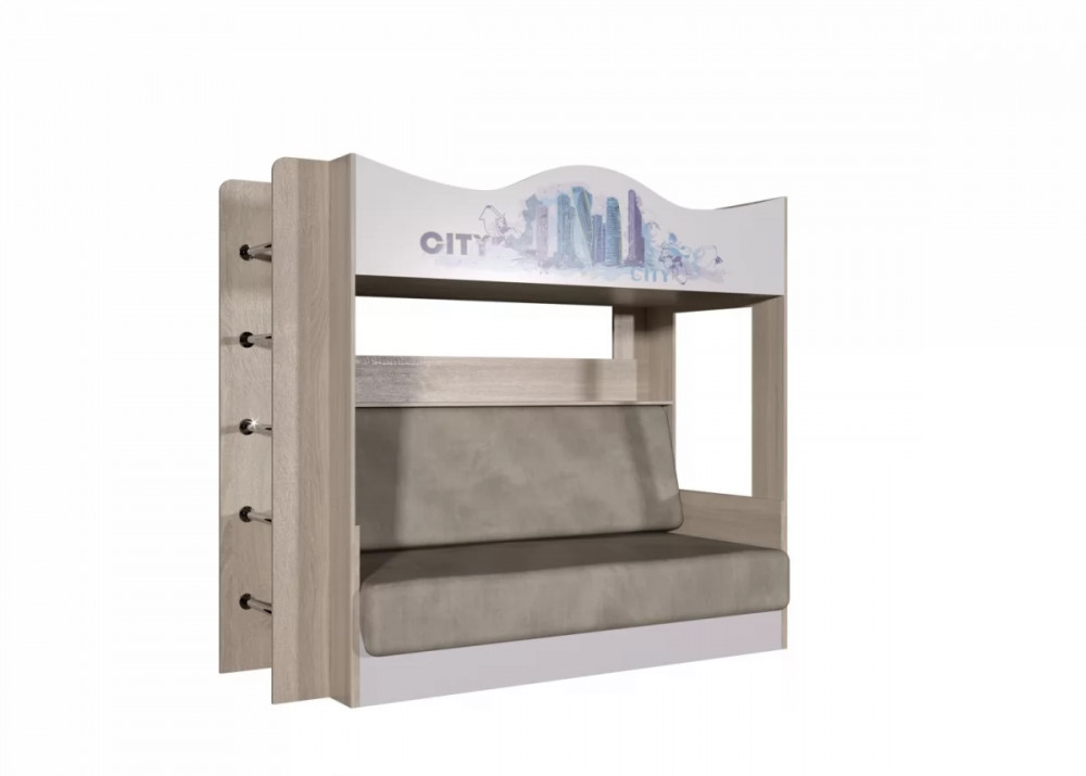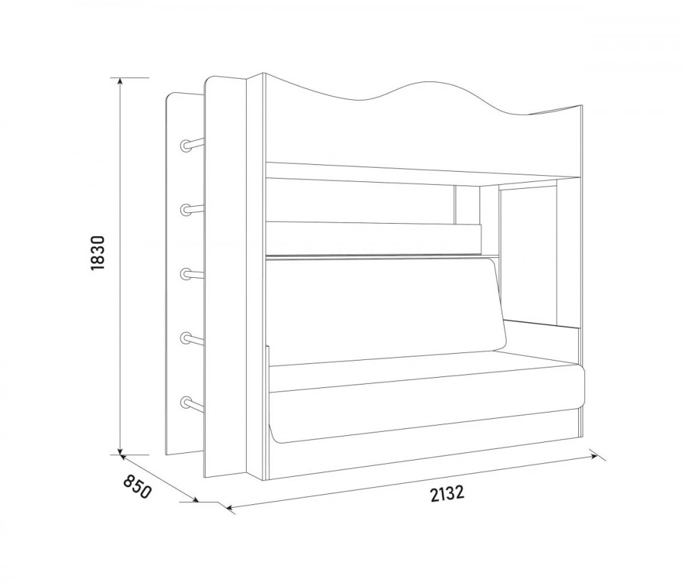 Если вам одновременно нужны двухъярусная кровать и диван-книжка для детской комнаты, то данное изделие - то что вам нужно. Нижний ярус такой конструкции – это классический раскладной диван со спальным местом. Наверх ведёт расположенная в торце кровати вертикальная лесенка с пятью перекладинами. Верхнее спальное место меньше по ширине, чем нижнее и оборудовано предохраняющим от падения бортиком.