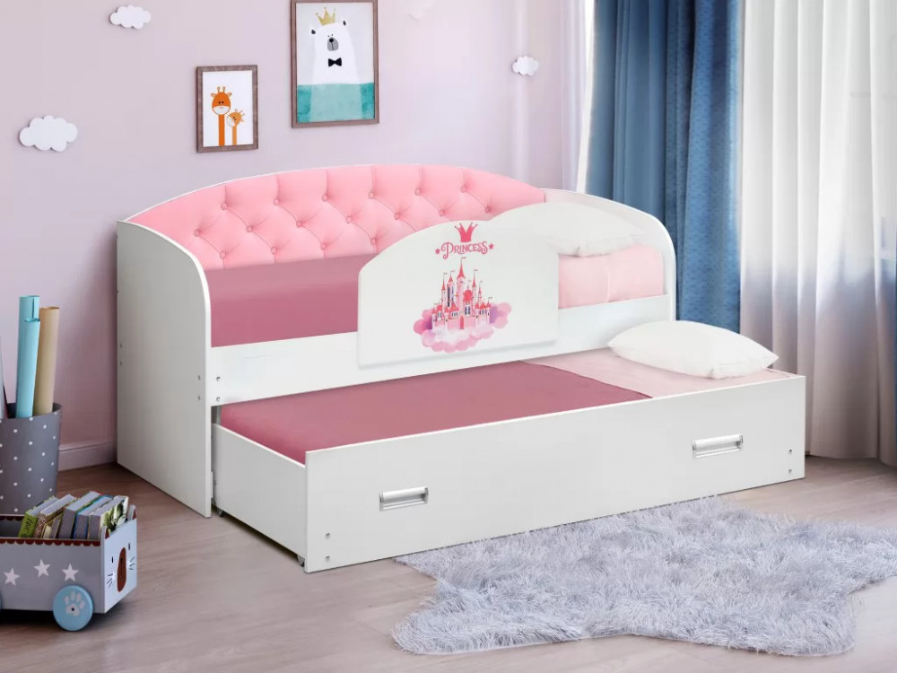 Кровать детская выдвижная с продольной мягкой спинкой велюр 336 борт с фотопечатью