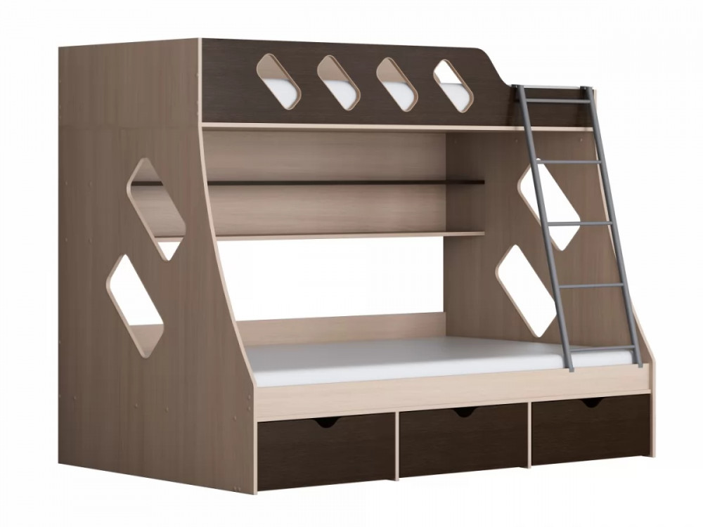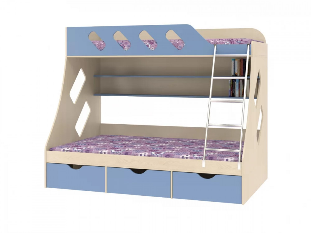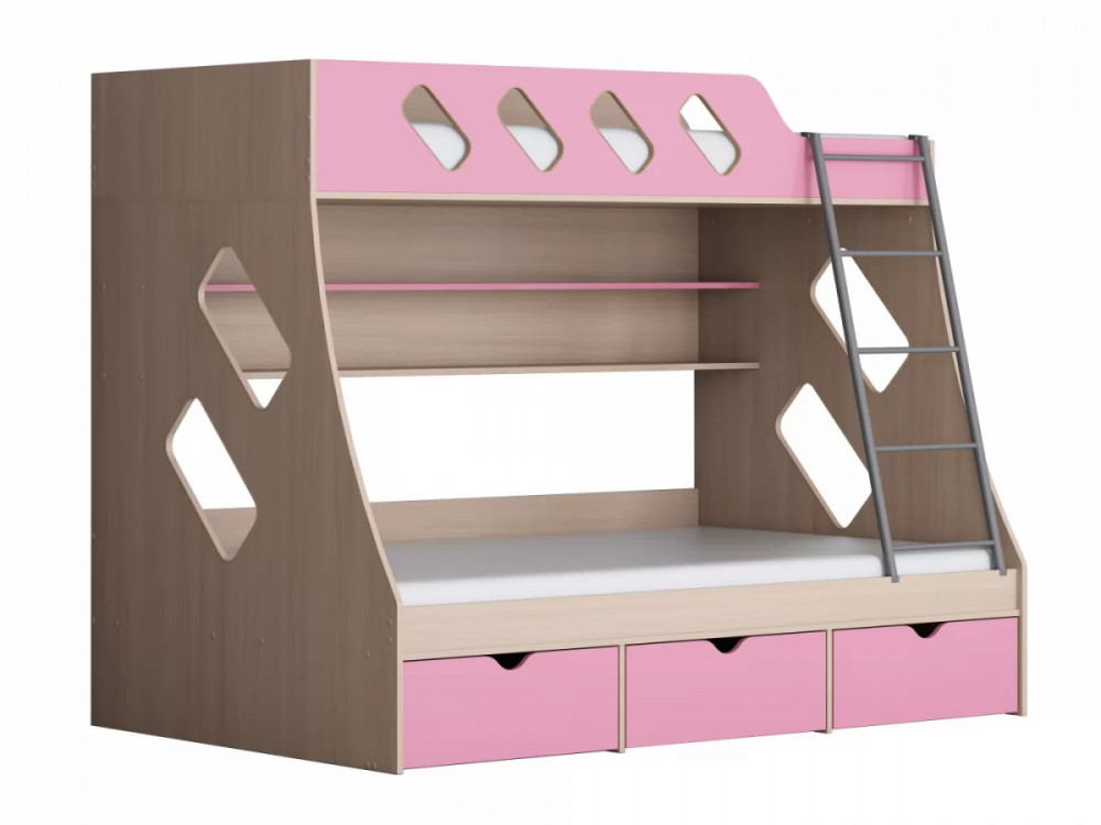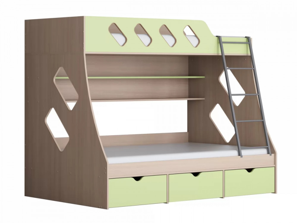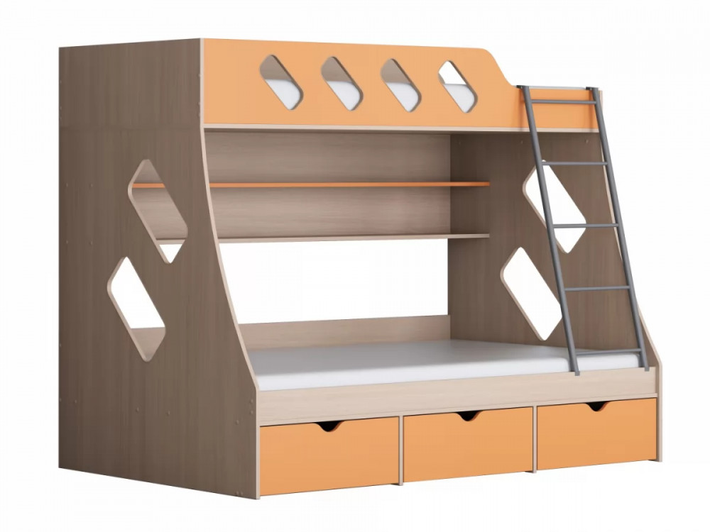 Под нижним ярусом расположены 3 вместительных выкатных ящика, в которых удобно хранить игрушки, постельное белье или личные вещи. Кровать оснащена двойной полкой для книг или аксессуаров. Верхний ярус защищен бортиком. Лестницу можно поставить слева или справа.