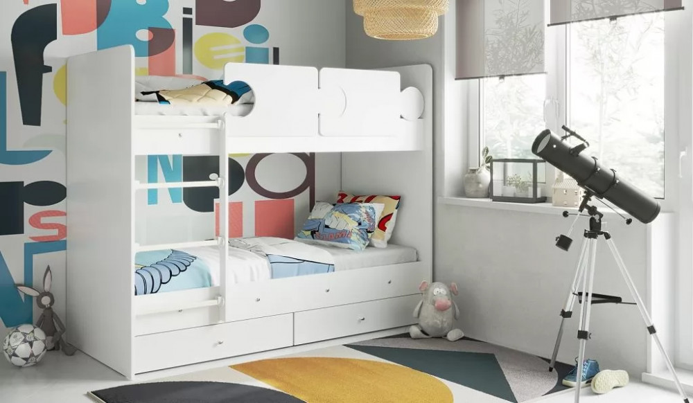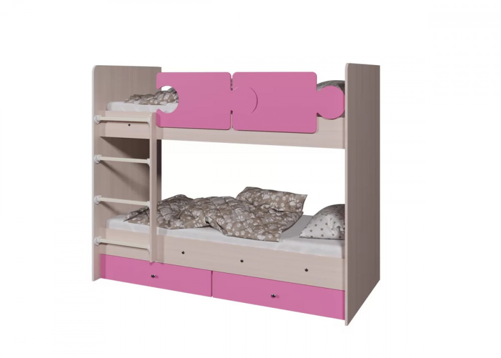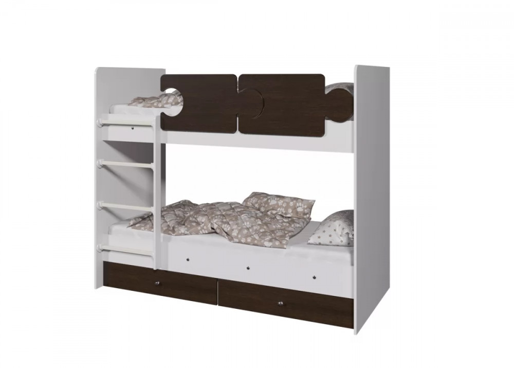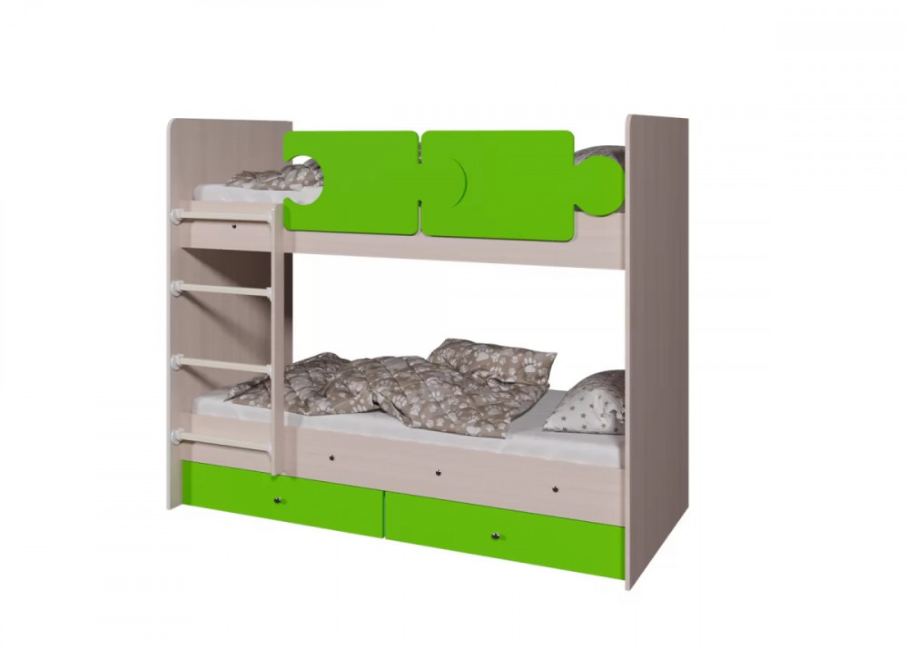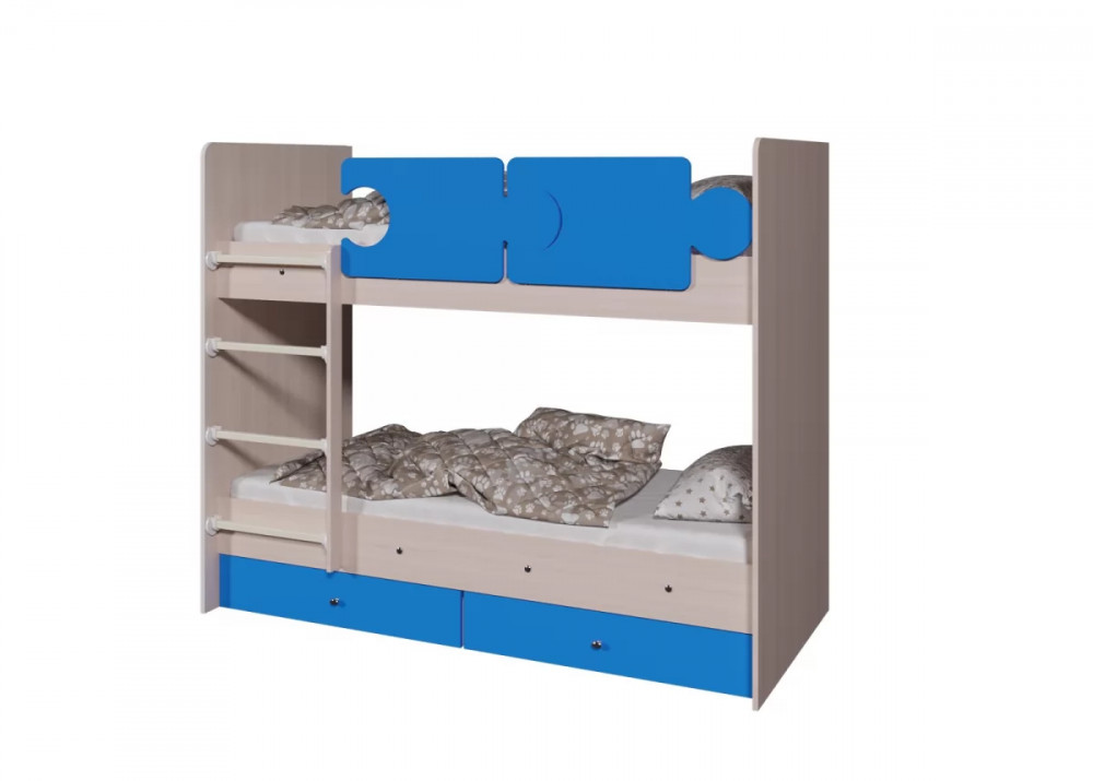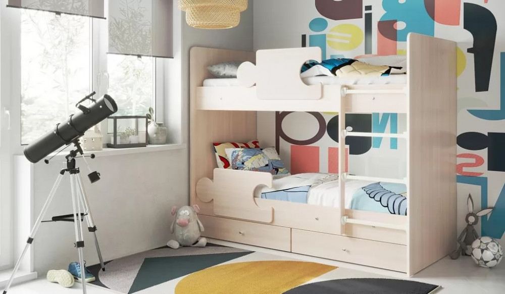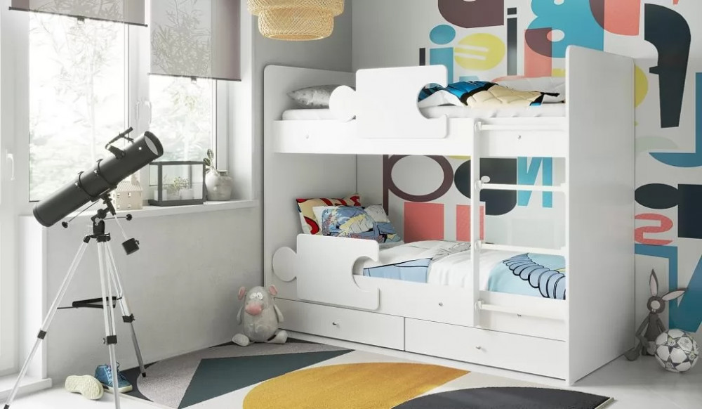 Ярким дополнением к кровати выступают бортики-трансформеры. Два бортика в форме элементов пазла можно расположить на верхнем ярусе или установить по одному сверху и снизу. Вместительные выкатные ящики для постельного белья или иных вещей можно расположить под нижним спальным местом.