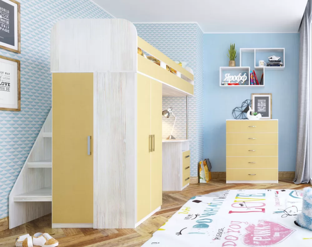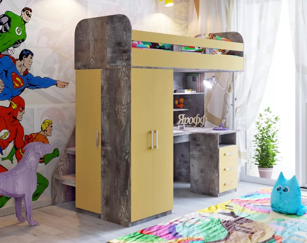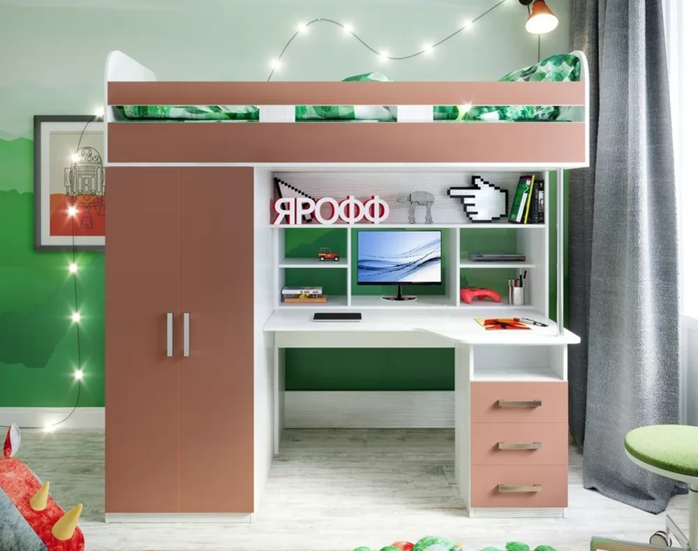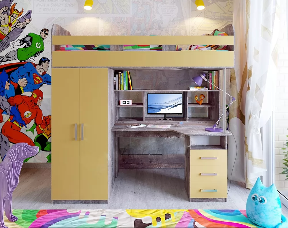 Кровать-чердак «Аракс» - практичная и многофункциональная мебель для комнаты школьника младших и даже старших классов. Современная и стильная мебель для детской, которая предусматривает все необходимое: удобную кровать, большой и вместительный шкаф, просторный стол для учебы и выполнения домашних зданий, на котором есть место для компьютера, открытые полки, а под ним – встроенная тумбочка с ящиками.