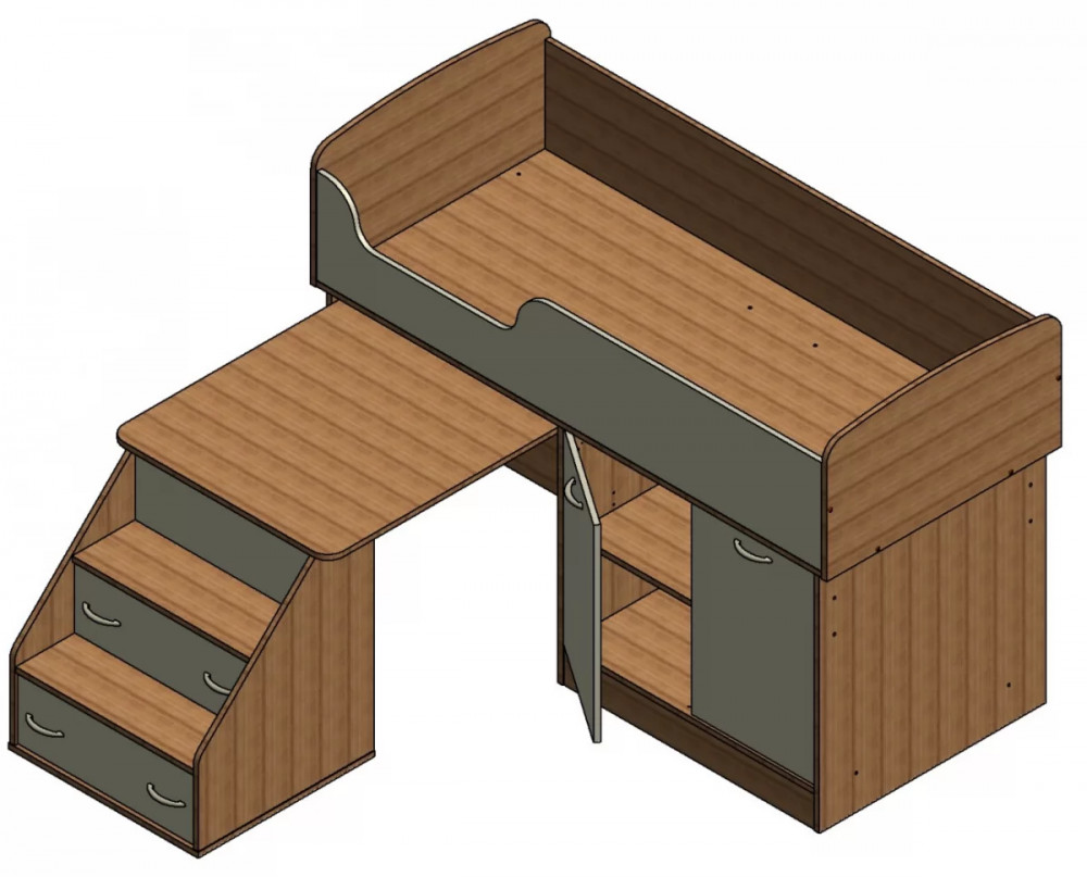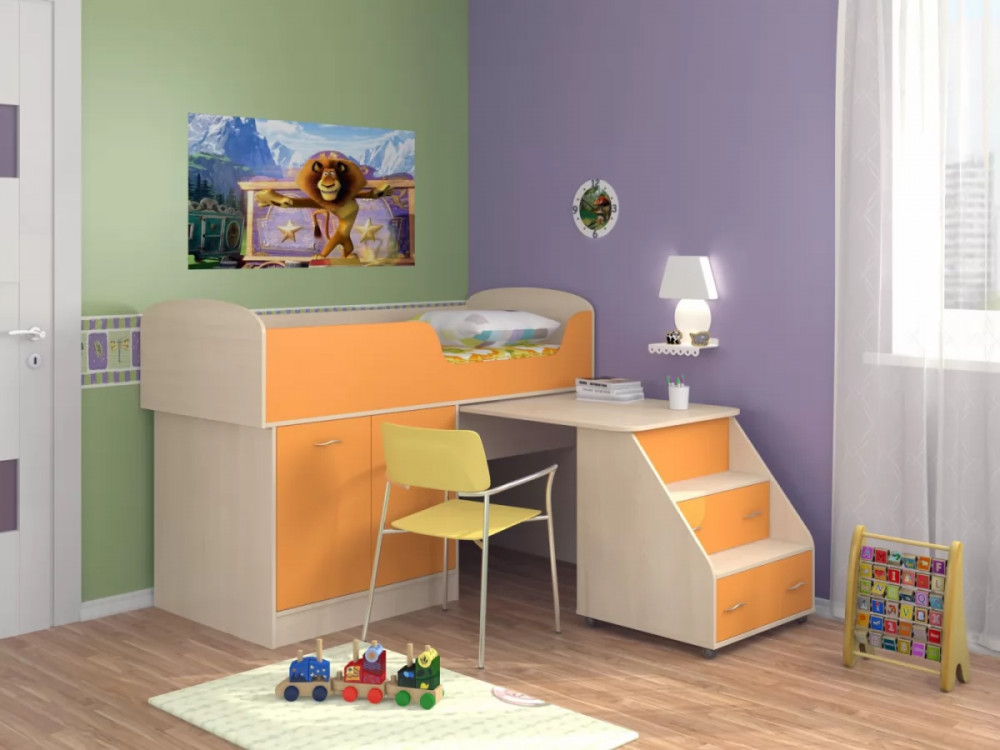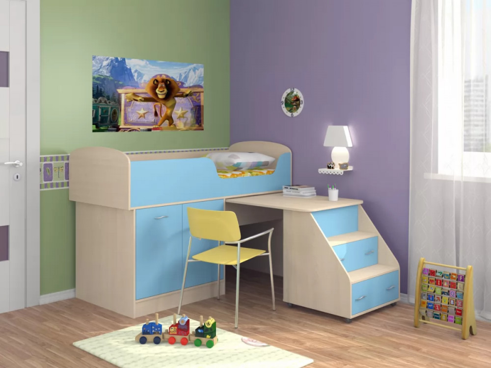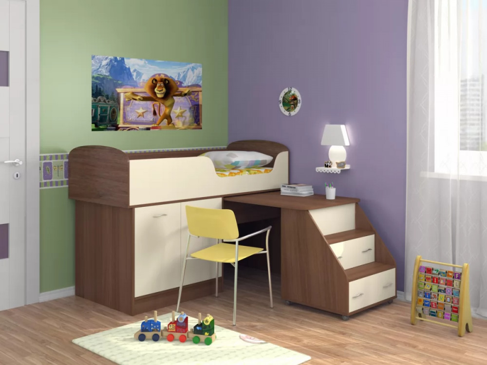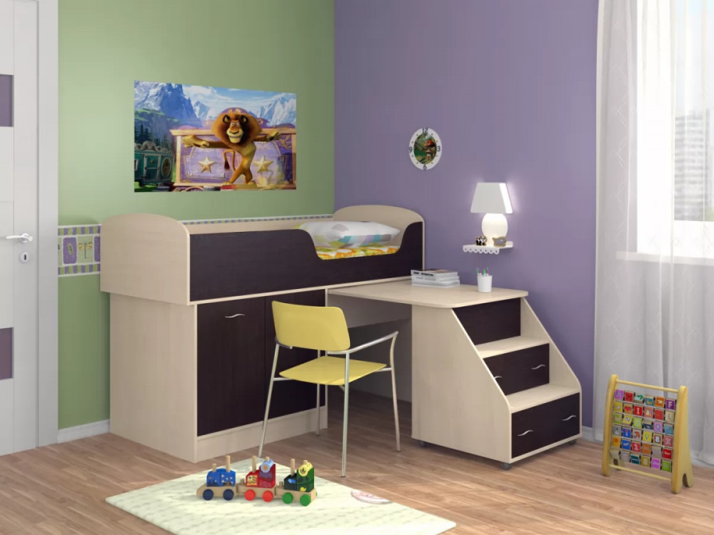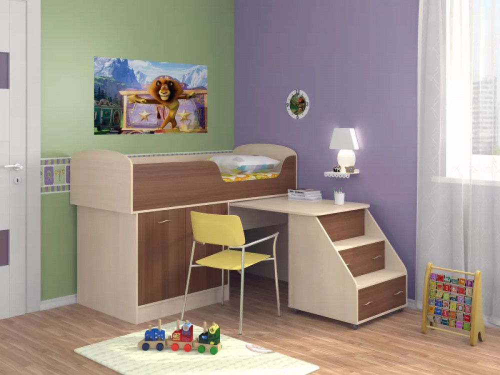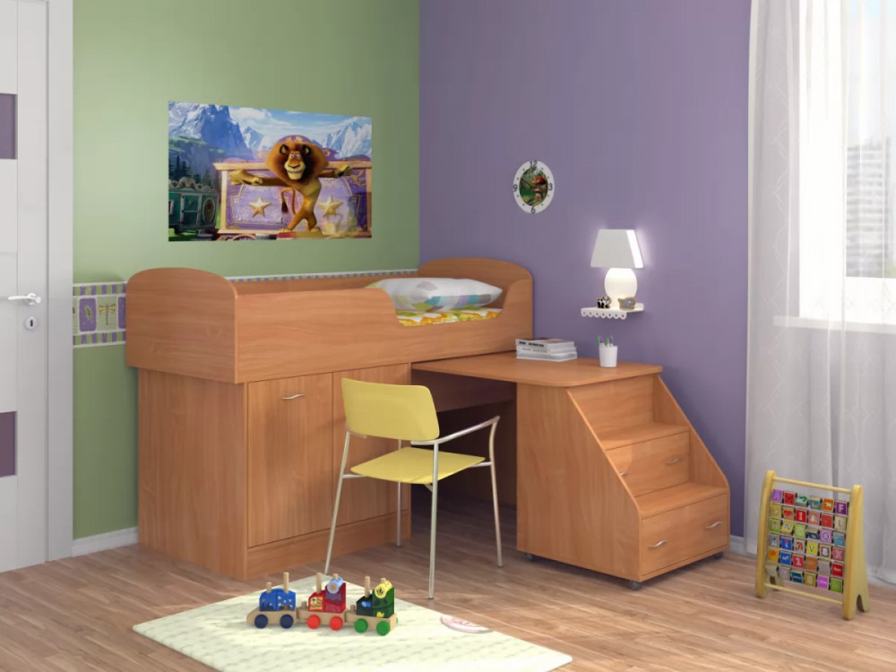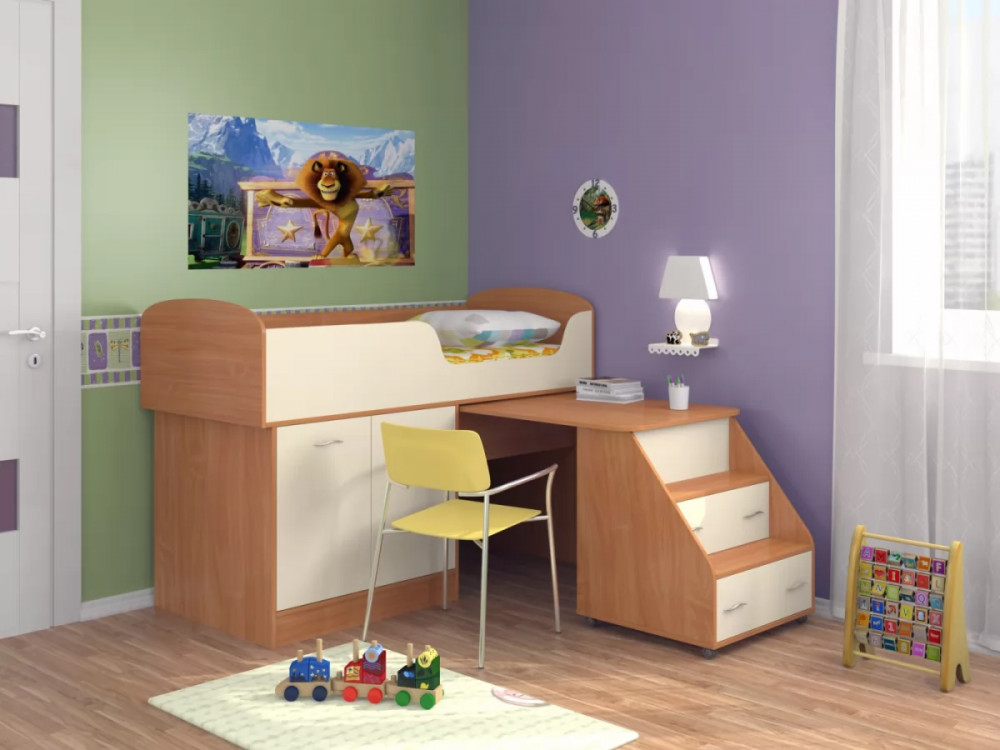 Кровать-чердак "Дюймовочка-2" подойдет детям от 1,5 до 10 лет. Кровать объединяет удобное спальное место, тумбу с полками для хранения вещей, письменный стол и лестницу, в ступеньках которой имеются вместительные ящики. Такой уголок экономит пространство в детской комнате, при этом обеспечивая все необходимые функции.