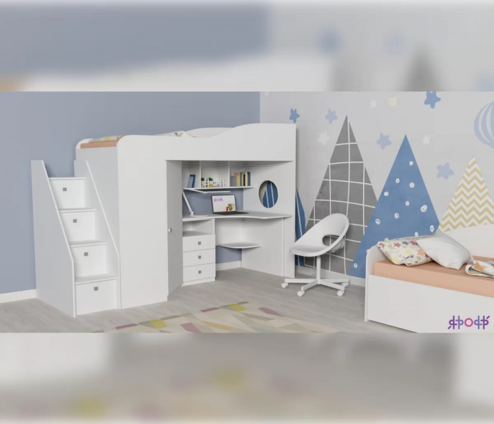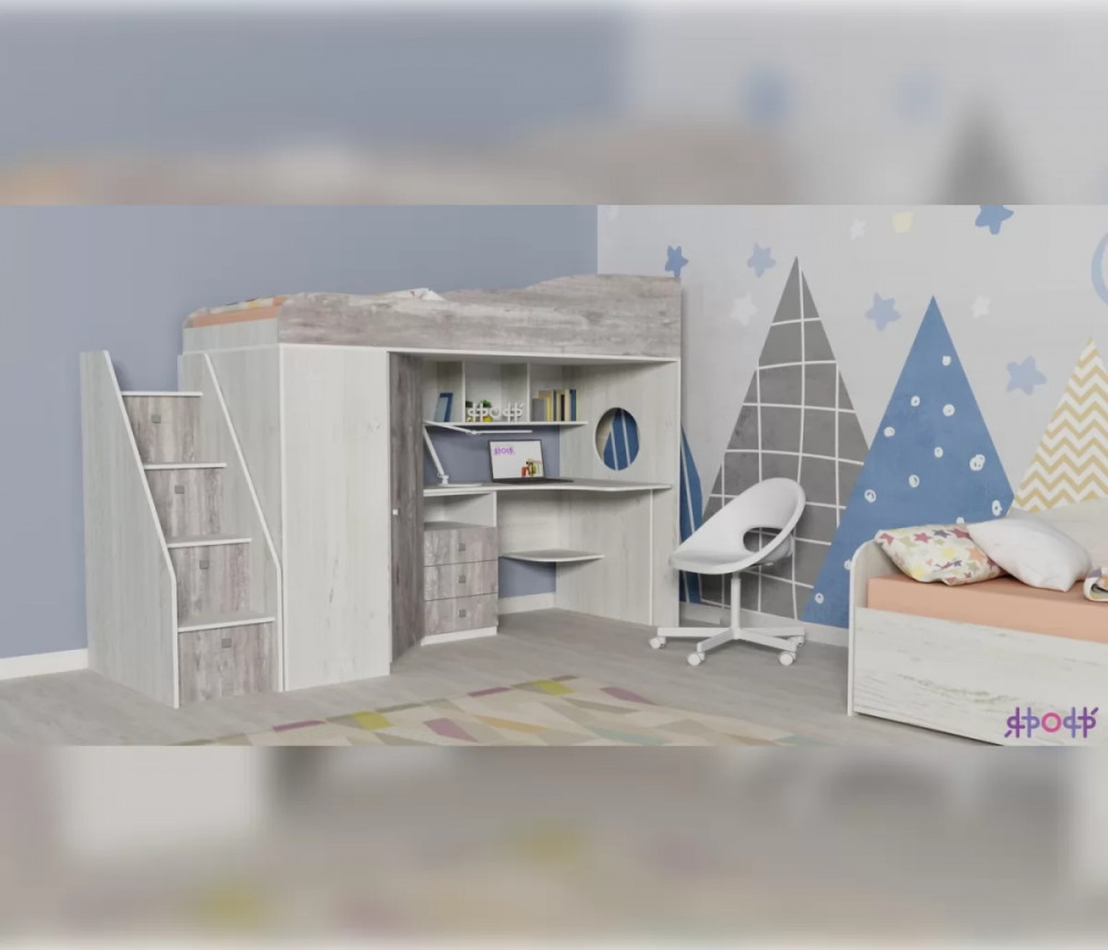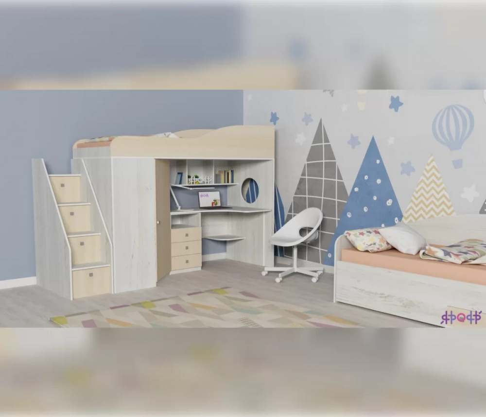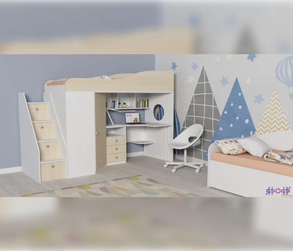 Двухъярусная кровать-чердак «Кадет-1» с рабочей зоной и универсальной лестницей - практичный и стильный предмет меблировки. Современная и стильная мебель для детской комнаты школьника, в которой предусмотрено не только наличие полноценной удобной кровати, но также просторный рабочий стол, над которым расположены полки для книг или декоративных мелочей, тумбочка с ящиками, полки и шкаф для одежды. Детская двухъярусная кровать помогает экономить и рационально использовать пространство комнаты, так как соединяет в себе несколько предметов мебели, при этом занимает место только для одной кровати.
