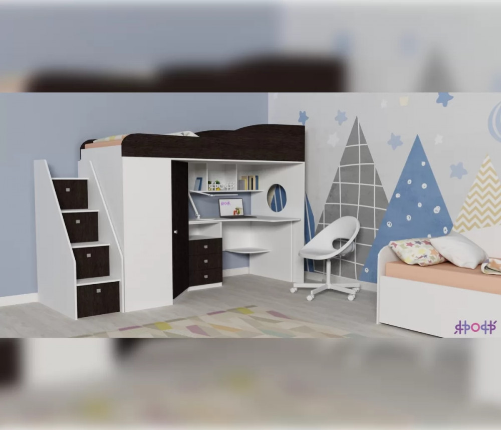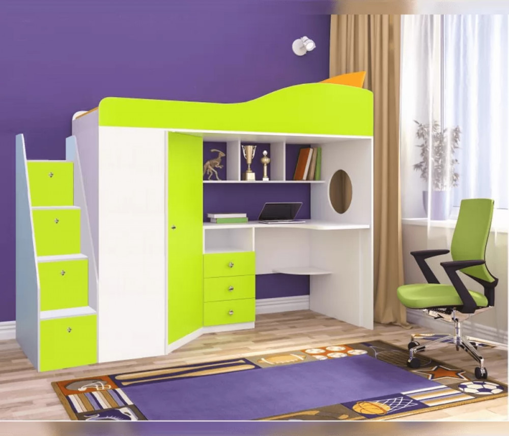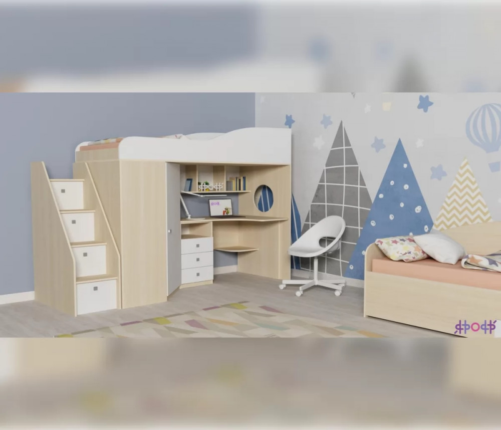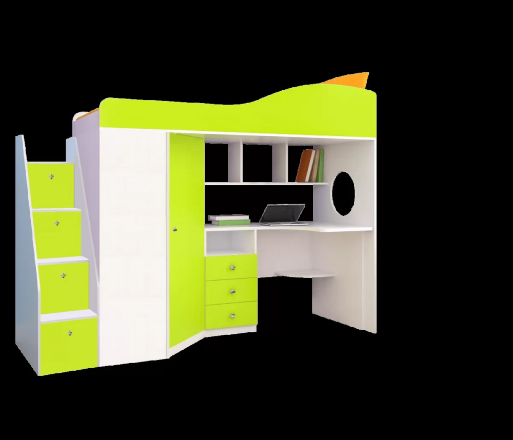 Двухъярусная кровать-чердак «Кадет-1» с рабочей зоной и универсальной лестницей - практичный и стильный предмет меблировки. Современная и стильная мебель для детской комнаты школьника, в которой предусмотрено не только наличие полноценной удобной кровати, но также просторный рабочий стол, над которым расположены полки для книг или декоративных мелочей, тумбочка с ящиками, полки и шкаф для одежды. Детская двухъярусная кровать помогает экономить и рационально использовать пространство комнаты, так как соединяет в себе несколько предметов мебели, при этом занимает место только для одной кровати.