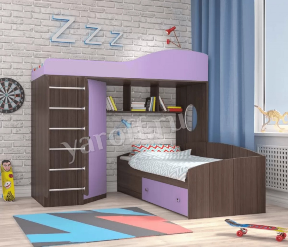 У кровати два удобных спальных места и приставная металлическая лестница надежной и крепкой конструкции. Навесные полки, встроенный угловой шкаф с полками позволяет удобно разместить постельное белье и одежду, и также другие мелочи при необходимости.
