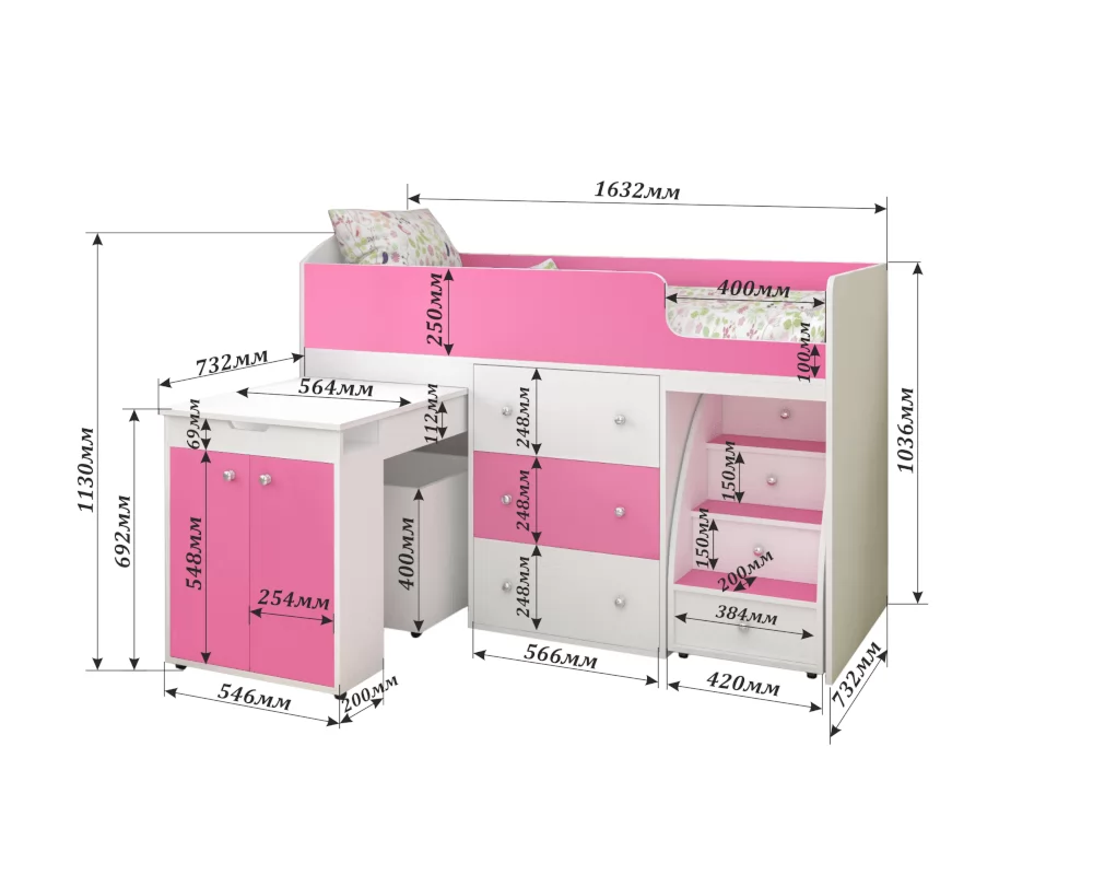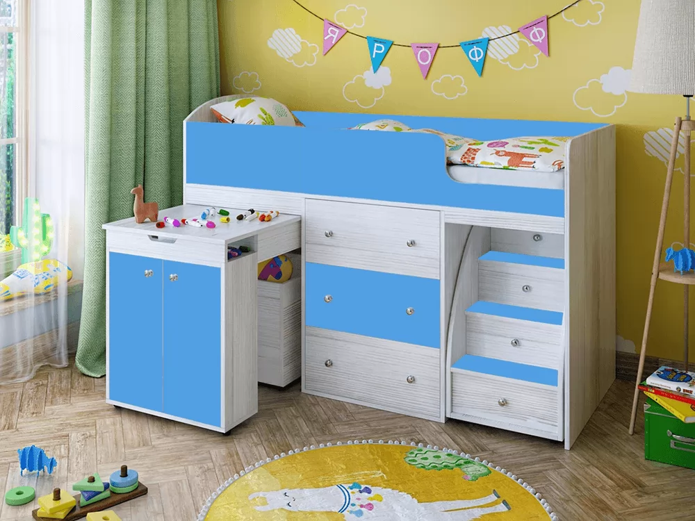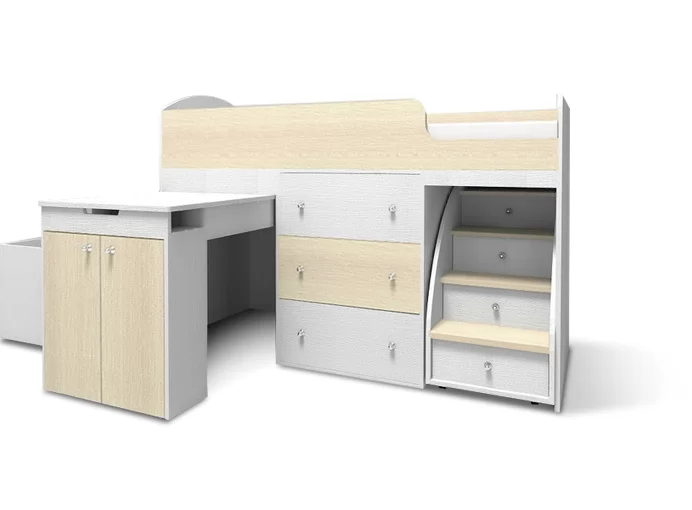 Кровать-чердак «Малыш» - это многофункциональный предмет мебели, который выполняет сразу несколько функций, ведь она является не только кроваткой, в ней также предусмотрено много вместительных мест для хранения (выдвижной стол, ящики разного объема, в которых можно разместить и игрушки, и постельное белье, и домашнюю одежду), это оптимальное решение для малогабаритной квартиры.