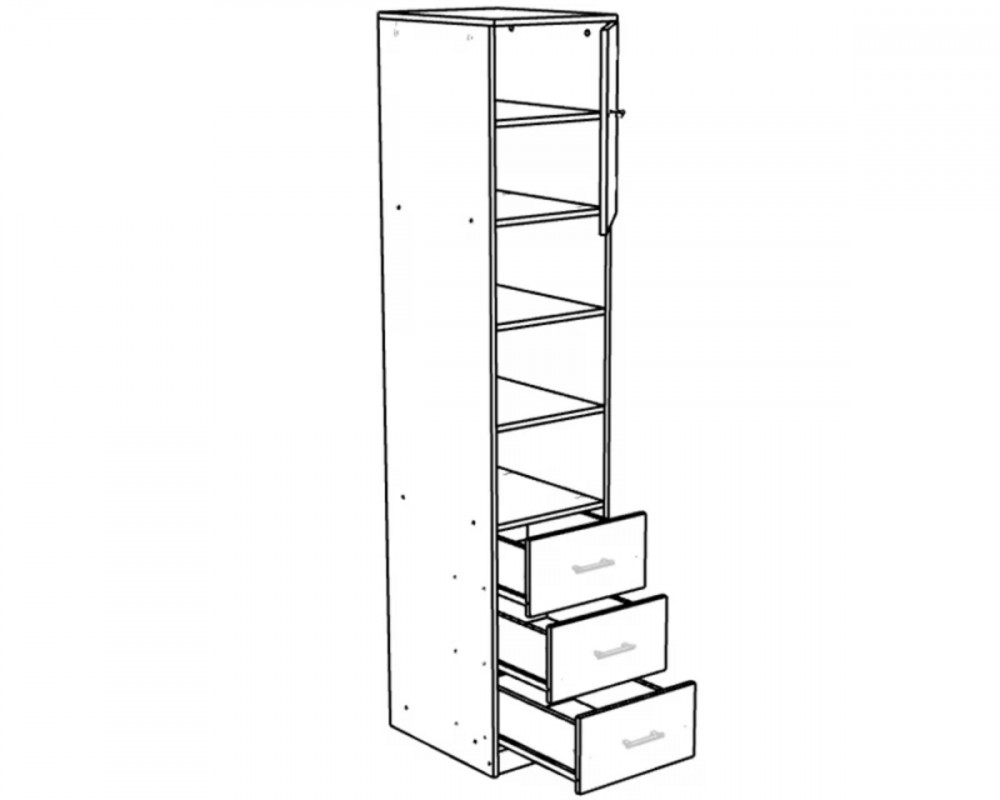 В шкафу-пенале имеются три выдвижных вместительных ящика в нижней части, а также пять открытых полок. Современный лаконичный дизайн, компактность, эргономичность и вместительность делают шкаф-пенал отличным решением для обустройства комфортной комнаты. Цвет каркаса и фасада можно выбрать в предложенной цветовой палитре, что облегчает подбор мебели под конкретный интерьер комнаты и ее цветовое оформление.