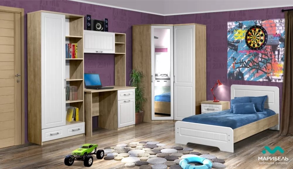Шкаф угловой с зеркалом ЮН-8 "Юниор-7" Дуб Баррик/Акация белая/Зеркало