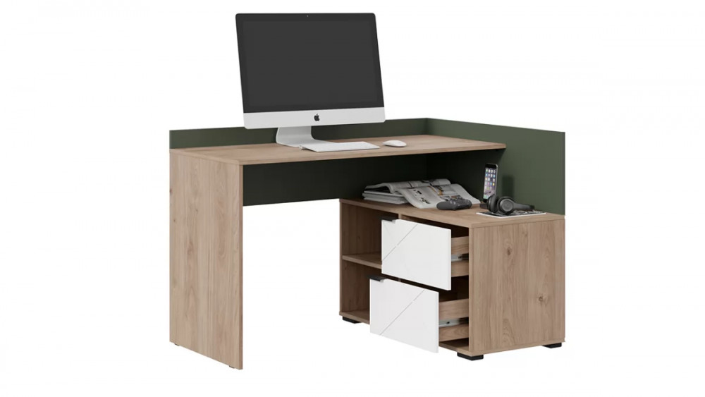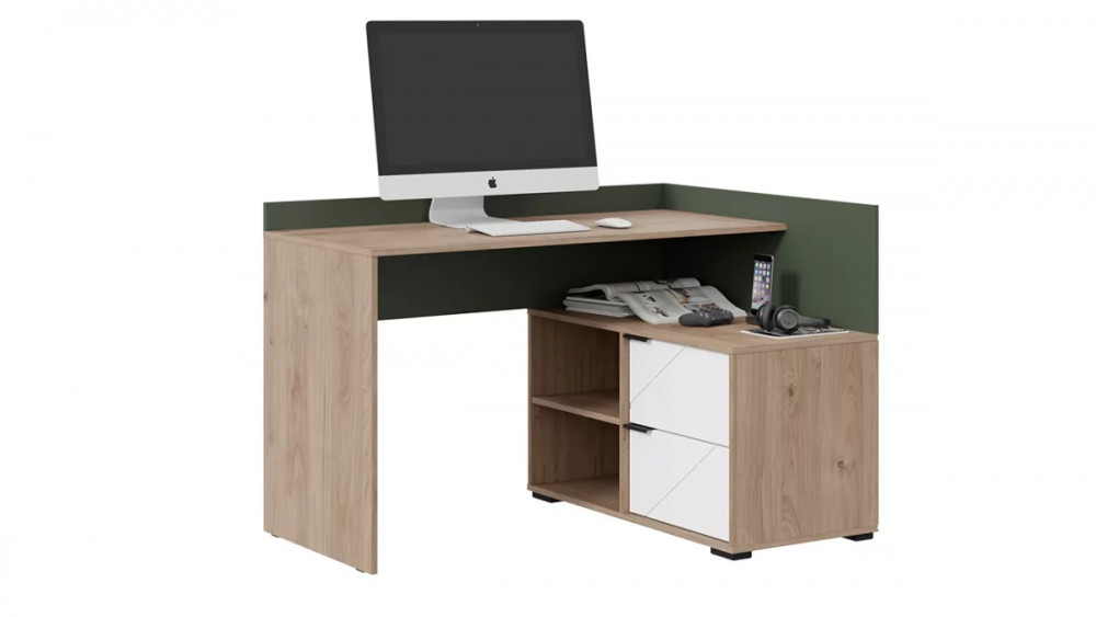 Стол письменный угловой «Лео» Гикори джексон/Белый матовый/Дымчатый зеленый