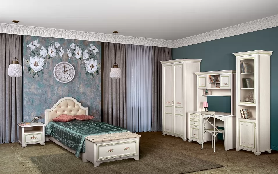 Детская «Флора» выполнена в классическом стиле и приятном светлом декоре «ясень белый». Изящный цветочный рисунок и серебристо-зеленая патина на светлом фоне придают мебели сдержанно-нарядный вид, благодаря чему комната будет выглядеть свежо и утонченно. Завершают внешний облик золотистые ручки с белой патиной в классическом стиле. Широкий модульный ряд позволяет создать комплекты под любой размер помещения и любой функционал. В этой детской есть оригинальные модули, которые интересным внешним видом добавят «изюминки» в интерьер.