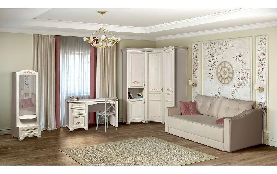Детская «Флора» выполнена в классическом стиле и приятном светлом декоре «ясень белый». Изящный цветочный рисунок и серебристо-зеленая патина на светлом фоне придают мебели сдержанно-нарядный вид, благодаря чему комната будет выглядеть свежо и утонченно. Завершают внешний облик золотистые ручки с белой патиной в классическом стиле. Широкий модульный ряд позволяет создать комплекты под любой размер помещения и любой функционал. В этой детской есть оригинальные модули, которые интересным внешним видом добавят «изюминки» в интерьер.