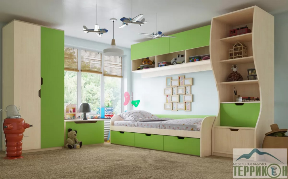 Атмосферу счастья и беззаботности приносит в дом детская «Киви». Сочетание оттенков лайм и дуб молочный выглядит очень жизнерадостно. Малышам нравится отдыхать и играть в такой комнате. Они с удовольствием спят на двух- или одноярусной кровати, хранят вещи в шкафу и на стеллажах, убирают игрушки в специальную тумбу и учат уроки за удобным письменным столом. Купить недорогов интернет-магазине "Диванчик-екб"