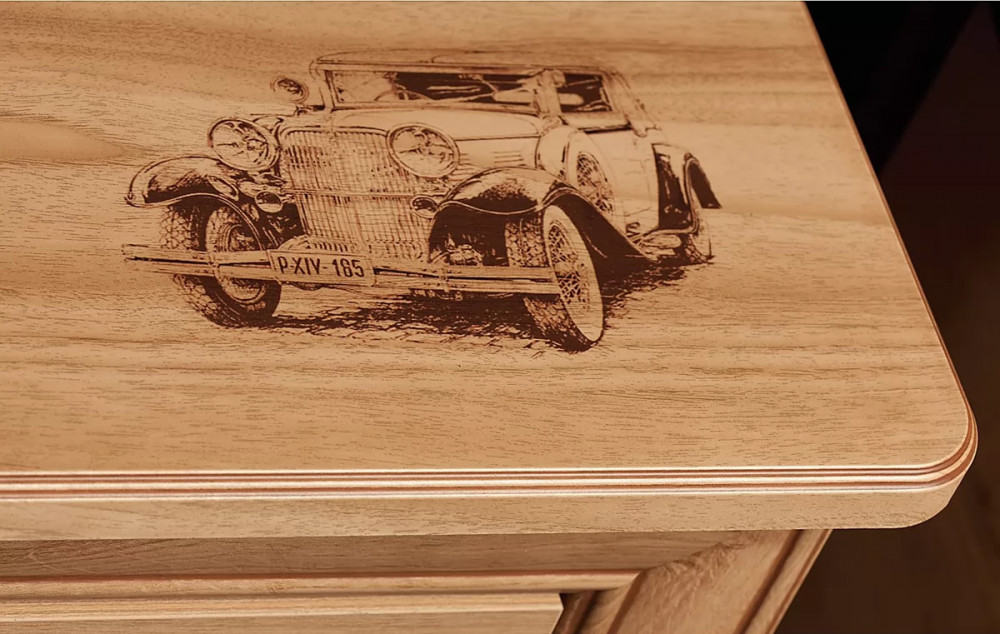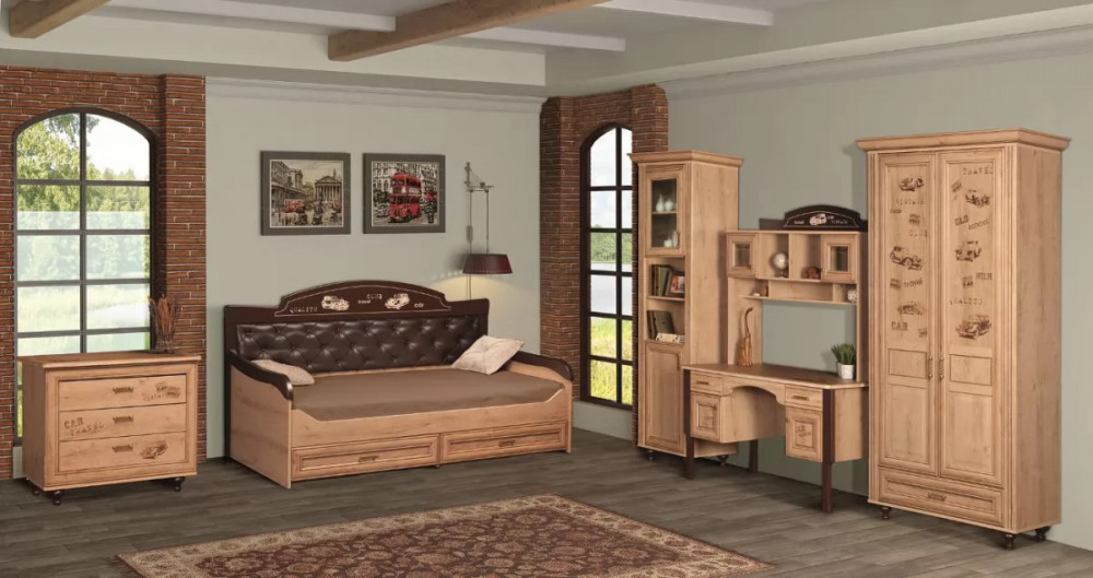 Мебель для детской комнаты «Ралли» – вариант мебели для мальчика, выполненной на базе модулей «Алиса». В основу дизайна модели положена тема гонок и ретро-машин, которыми украшены фасады. Это удачная альтернатива морской темы, так популярной в классической мебели. Кроме того в дизайне угадываются черты стиля Кантри, благодаря использованию древесного декора и патины на фасадах.