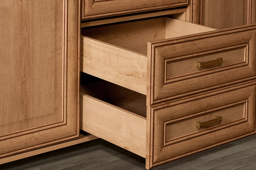 Мебель весьма практична в использовании, благодаря износоустойчивым материалам на горизонтальных поверхностях, качественным металлическим ручкам и надежной фурнитуре. Для плавного и бесшумного закрывания дверей шкафы комплектуются амортизаторами ударов.