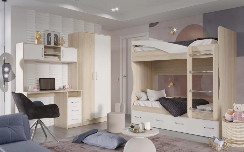 Детская Буратино Стол с ящиками( Размеры(Ш*Г*В): 1150х590х750 мм; Цвет: Сонома/белый; Материал: ЛДСП;) [ арт. 3911644 ]1 шт.Детская Буратино Надстройка для стола( Размеры(Ш*Г*В): 1150х300х850 мм; Цвет: Сонома/Белый; Материал: ЛДСП;) [ арт. 3911645 ]1 шт.Детская Буратино Кровать 2х ярусная( Размеры(Ш*Г*В): 1892*982*1855 мм; Цвет: Дуб сонома/белый; Спальное место: 800*1860 мм; Материал: ЛДСП;) [ арт. 3911639 ]1шт.Детская Буратино Шкаф для одежды( Размеры(Ш*Г*В): 800х520х1950 мм; Цвет: Сонома/белый; Материал: ЛДСП;) [ арт. 3911647 ]1 шт.| Цвет | Бежевый, Белый |