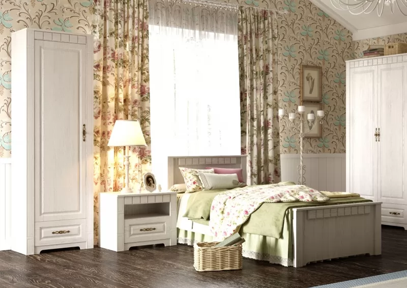 Детская Прованс позволит рационально использовать пространство комнаты для девочки и обустроить различные функциональные зоны: для отдыха, игр, учебы. Базовая комплектация включает кровать с ортопедическим основанием, прикроватную тумбу, однодверный шкаф для одежды. В коллекции также представлены двухстворчатый шкаф, комод, стеллаж, туалетный столик с откидной столешницей и зеркалом, письменный стол для организации удобного рабочего места. Все модули выполнены в характерной светлой цветовой гамме. Рамочные фасады с фрезеровкой и винтажными ручками – неотъемлемые элементы романтичного стиля французской провинции.