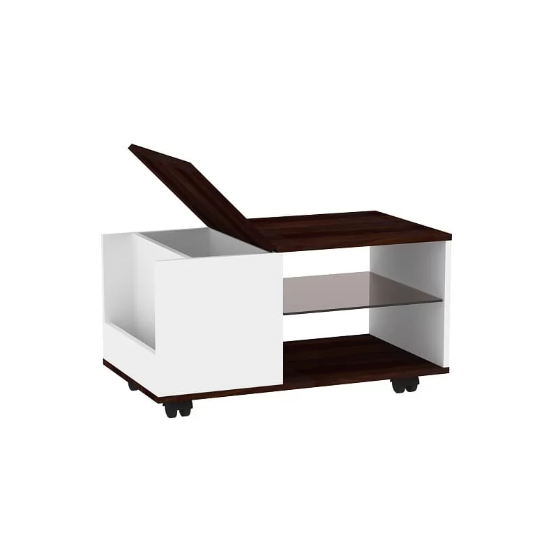 Журнальный столик НОРВУД 17 на колёсиках, которые дают возможность использовать его как функциональный сервировочный столик, который в любой момент можно легко перекатить в нужное место. Ниша с торца стола предназначена для хранения журналов или настольных игр, а сервировочное отделение с откидной столешницей – очень практичное решение для небольших семейных фуршетов. Полка из тонированного стекла цвета BRONZE подчеркивает эстетику и функционально дополняет компактный журнальный столик.