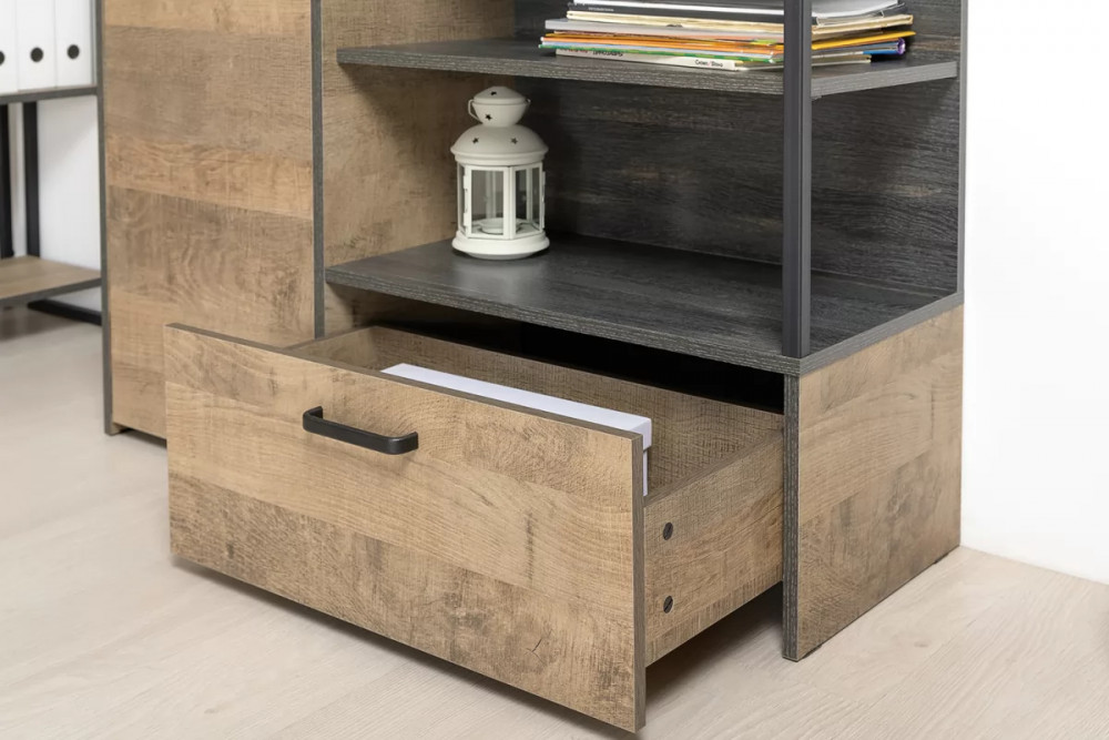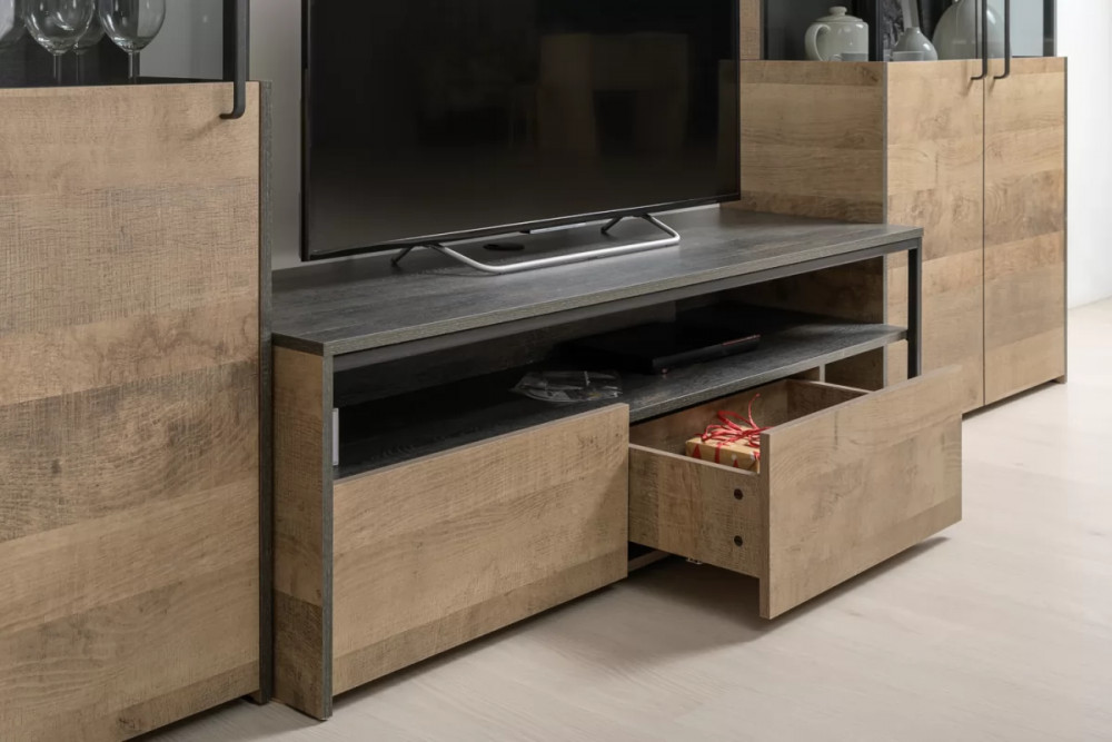 Индустриальная гостиная в стиле лофт. Все петли и направляющие оснащены доводчиками, что несомненно сделает ежедневное пользование приятным и безопасным. Металлические стойки с регулируемыми опорами делают эту мебель надёжной, аутентичной и функциональной. Лицевая фурнитура с тем же покрытием придаёт мебели индустриальную эстетику. Светодиодная подсветка в витринах с тонированным стеклом — эффектно подчёркивает аксессуары.