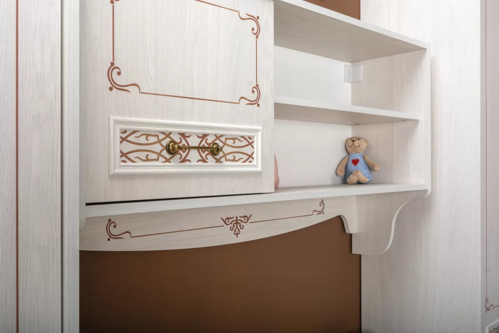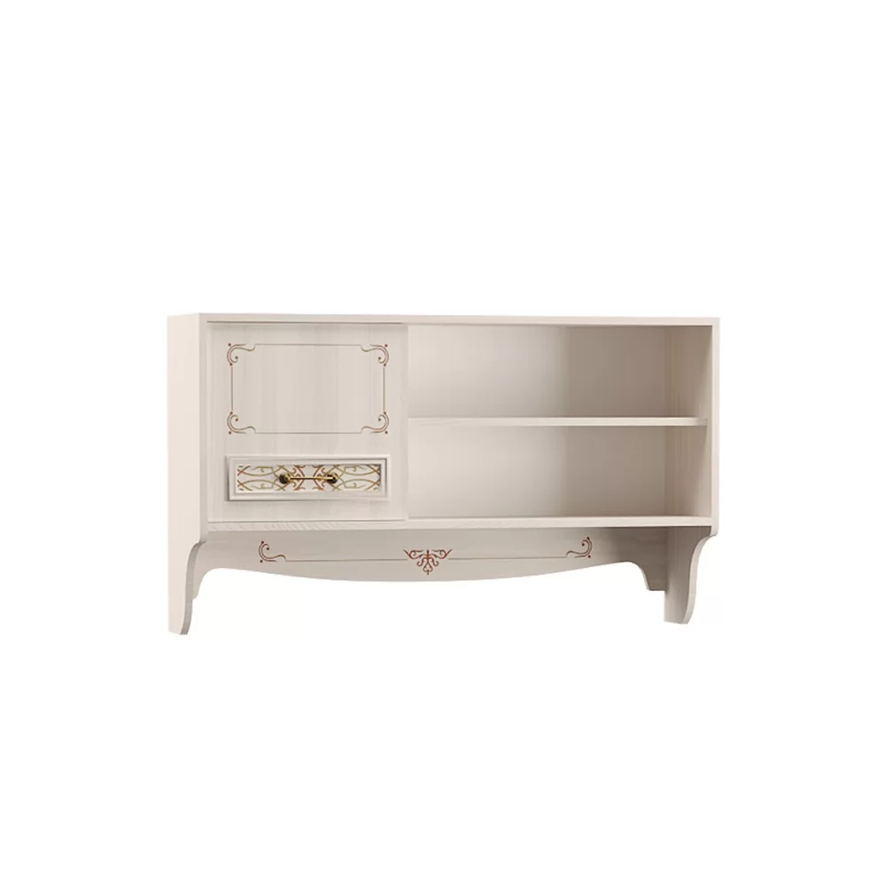 Навесная полка "Флоренция" №10.119 включает в себя закрытую нишу за распашной дверцей и открытую нишу с полкой. Модель привлекает внимание классической геометрией и узорчатой фотопечатью. Фасады дополнительно украшены декоративным профилем.