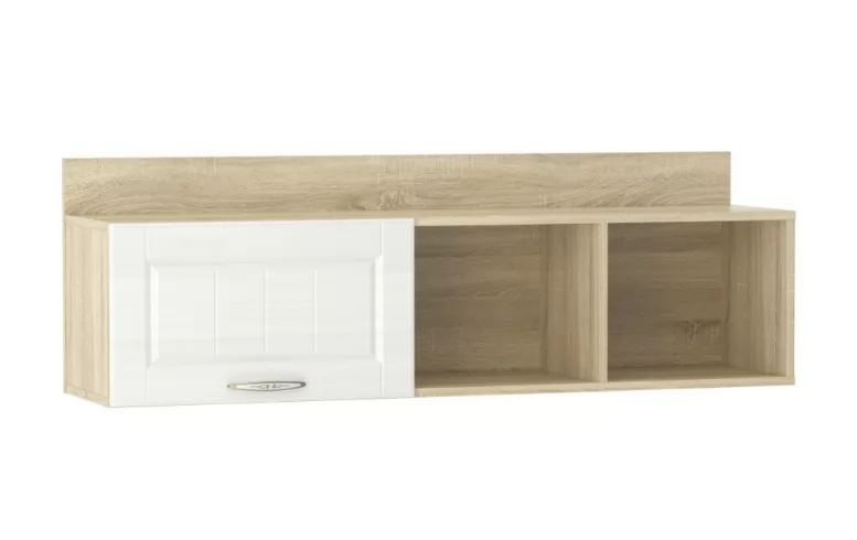 Полка Оливия НМ 011.38-01 Х органично дополнит рабочее место в детской. Закрытая секция модуля подойдет для хранения книг. Газлифты максимально высоко поднимают фасад вверх, обеспечивая большую площадь обзора содержимого. Предметы декора будут хорошо смотреться в открытых секциях полки.