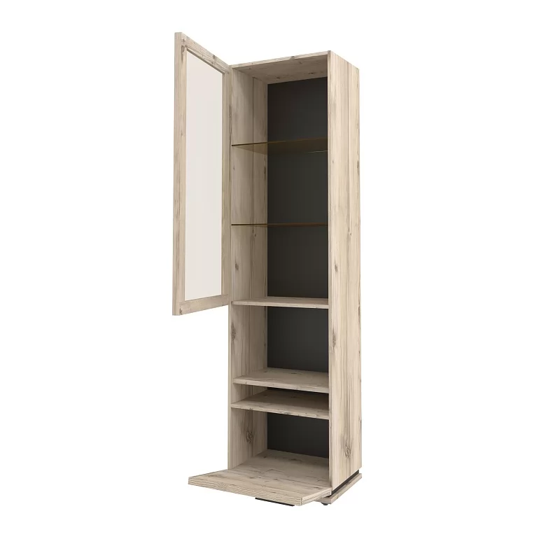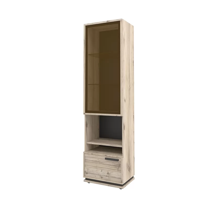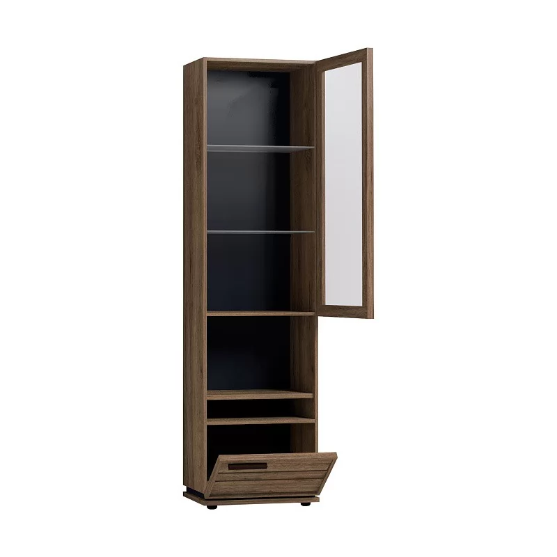 Высокий шкаф для посуды удобен своей функциональностью и эргономичностью конструкции. За тонированным фасадом из серого стекла 2 регулируемые по высоте бесцветные стеклянные полки. Витрина открывается за свес. На открытой полке разместите фотографии или элементы декора, а за глухим откидным фасадом спрячьте документы и ценные вещи от посторонних глаз. Регулируемые опоры шкафа позволят компенсировать незначительные неровности пола.